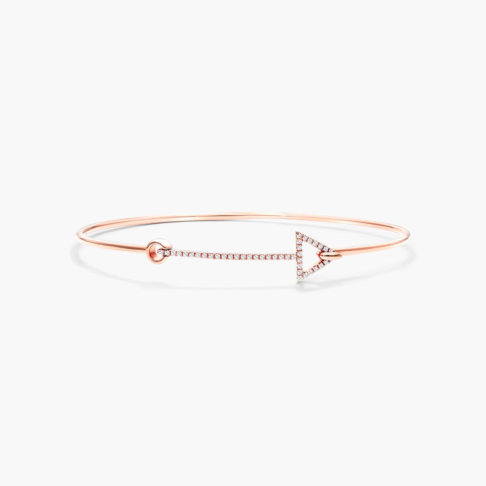 Sleek and modern, this diamond bangle bracelet features a delicate arrow composed of a single row of diamonds extending from a circle of 14K rose gold. The open triangle head of the arrow acts a clasp for ease of wear.