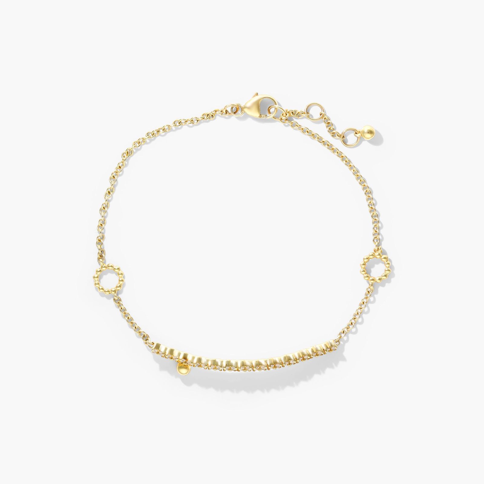 13 delicate clovers of prong set diamonds surrounding 14k gold centers come together to create a beautifully feminine bar at the center of this dainty chain bracelet. Sculpted open circles of 14K yellow gold stationed along the chain and a gold bead drop lend added detail to this special piece.