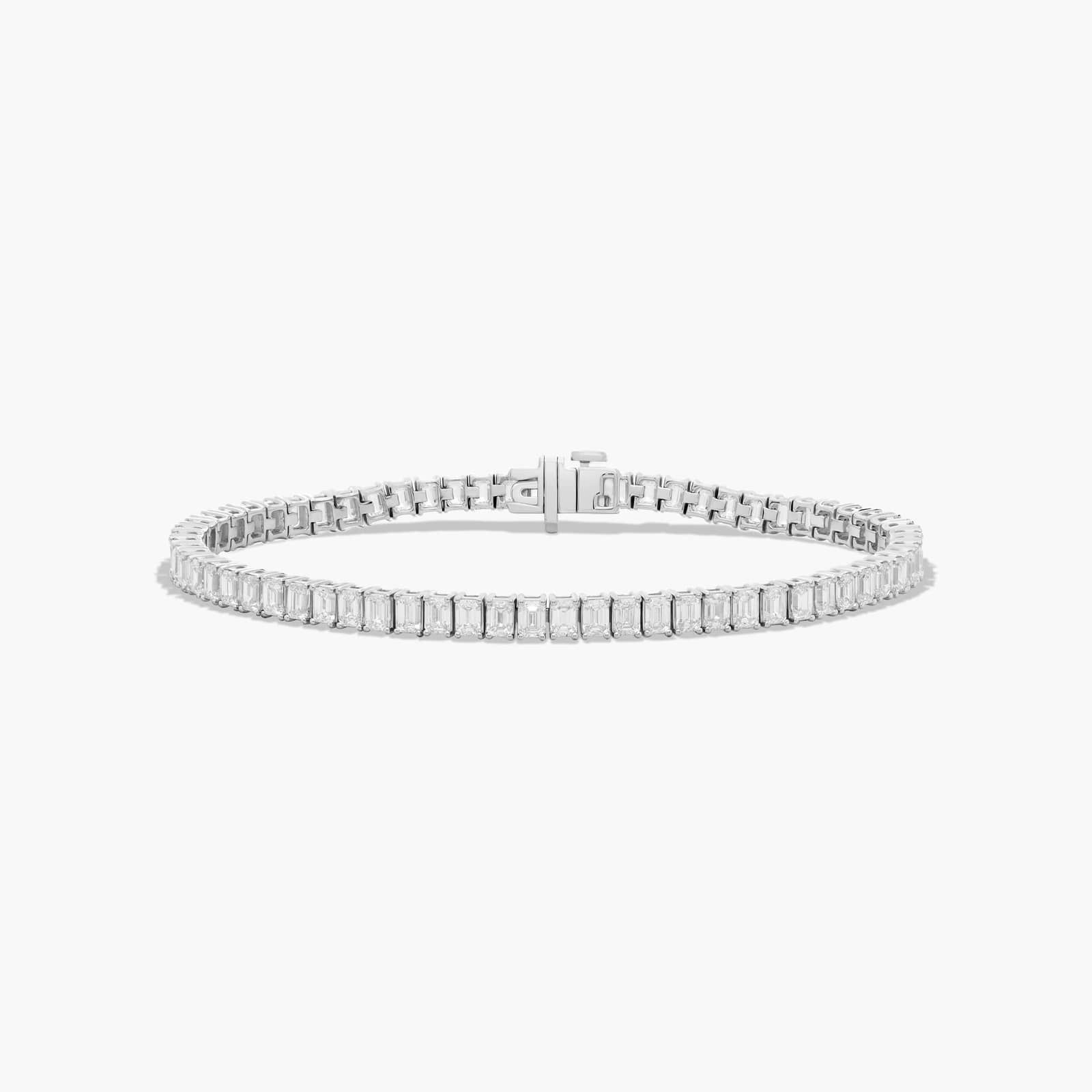 This classy tennis bracelet features the slender yet bold reflections of the emerald cut diamonds. This elegant gleam instantly lends splendor and sophistication.