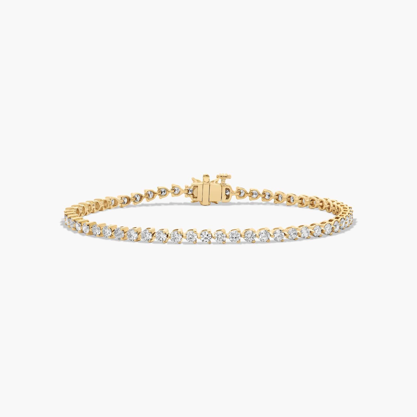 This classic tennis bracelet features a single row of scintillating brilliant cut diamonds set in finely crafted three prong baskets and closed by an elegant flower clasp.
