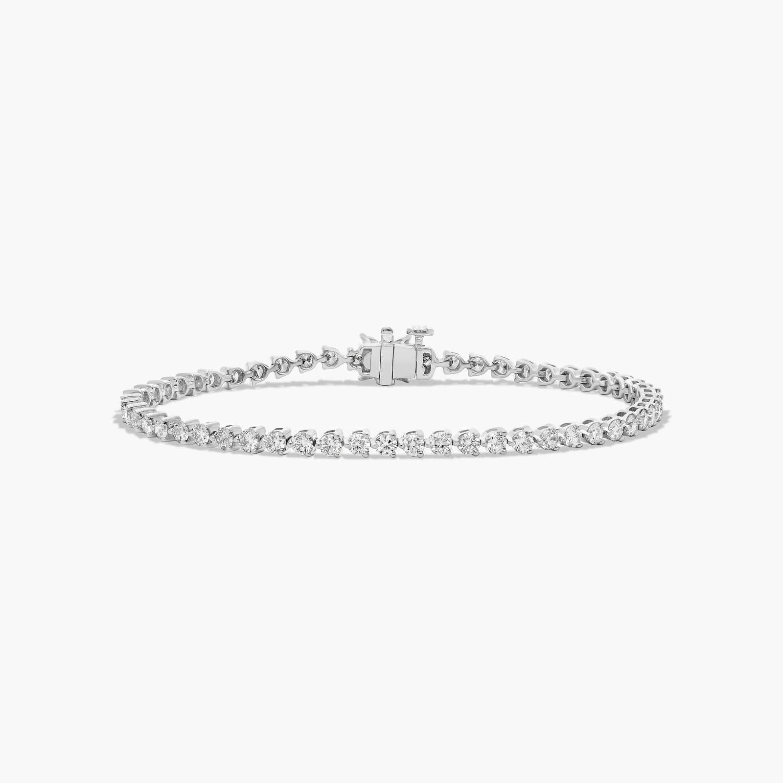 This classic tennis bracelet features a single row of scintillating brilliant cut diamonds set in finely crafted three prong baskets and closed by an elegant flower clasp.