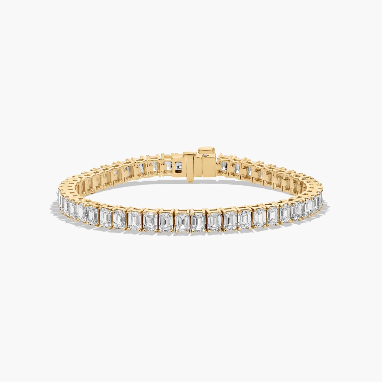This classy tennis bracelet features the slender yet bold reflections of the emerald cut lab-grown diamonds. This elegant gleam instantly lends splendor and sophistication.