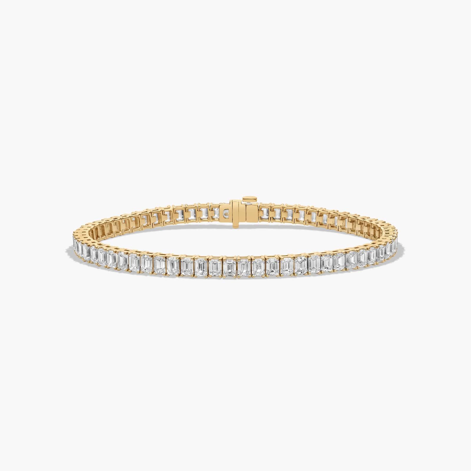This classy tennis bracelet features the slender yet bold reflections of the emerald cut lab-grown diamonds. This elegant gleam instantly lends splendor and sophistication.