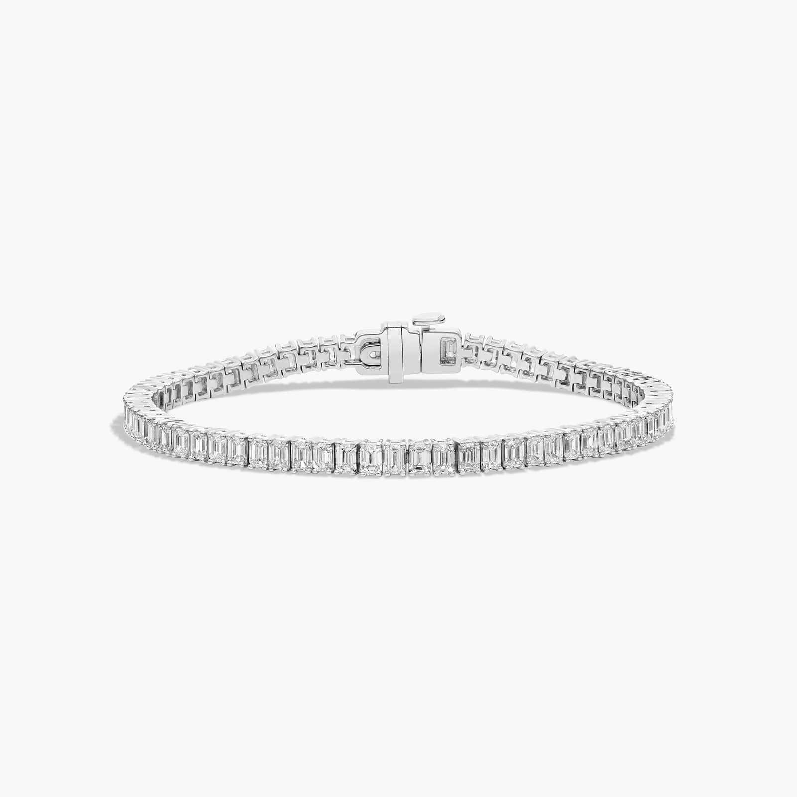 This classy tennis bracelet features the slender yet bold reflections of the emerald cut lab-grown diamonds. This elegant gleam instantly lends splendor and sophistication.