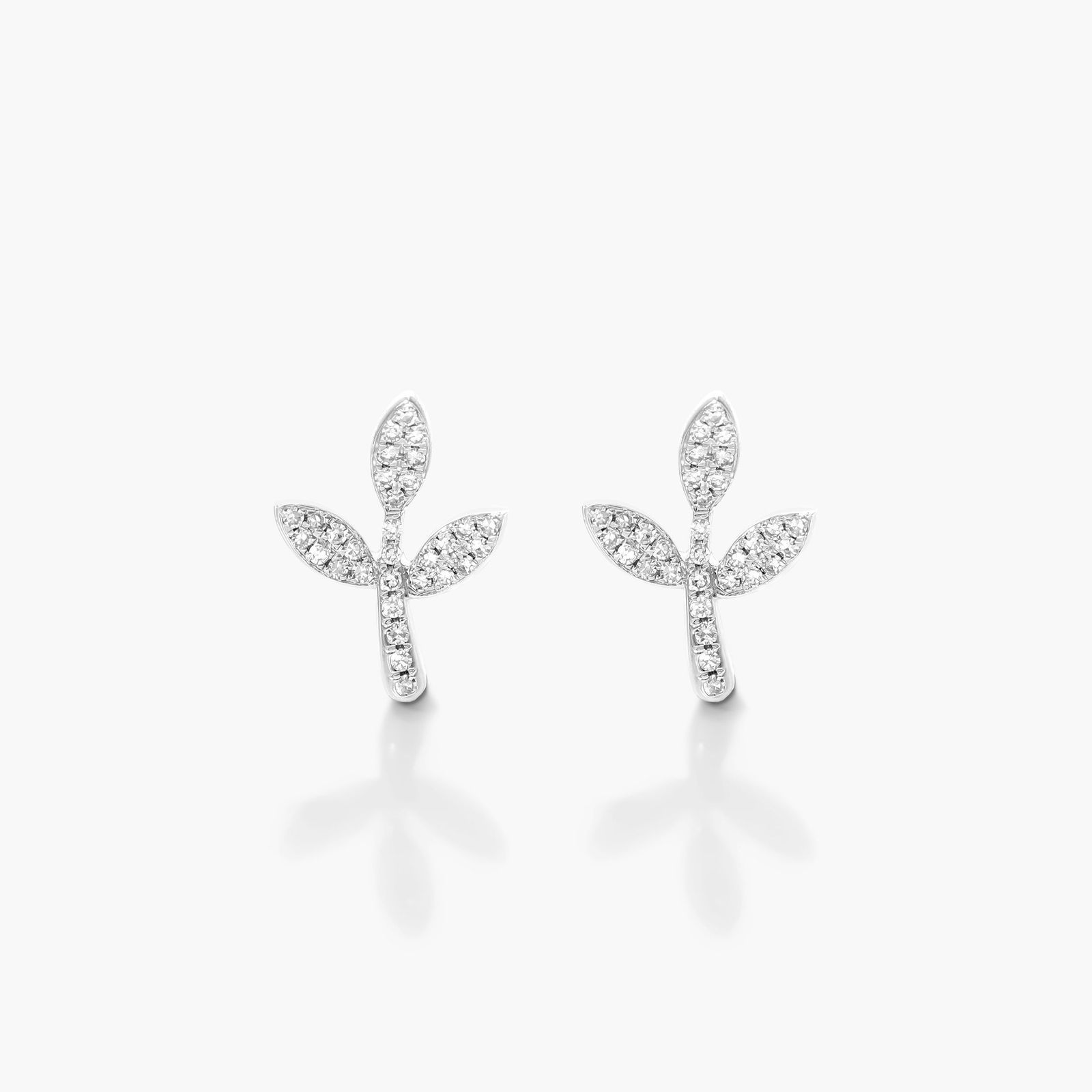 This pair of contemporary earrings features three diamond studded leaves subtly curving along its diamond stem. Modern and romantic, these delicate earrings crafted in 14K white gold are perfect for everyday wear.