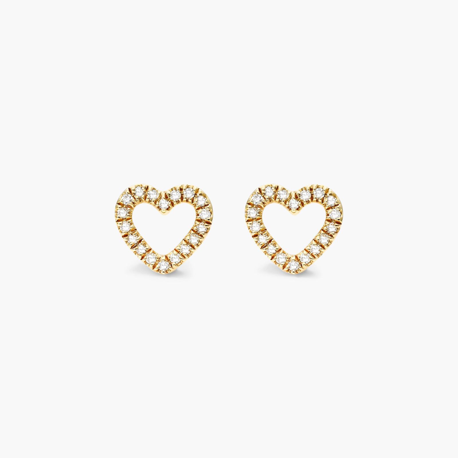 These open diamond heart studs are a contemporary take on a classic look. Set in 14K yellow gold, they perfect for everyday wear.