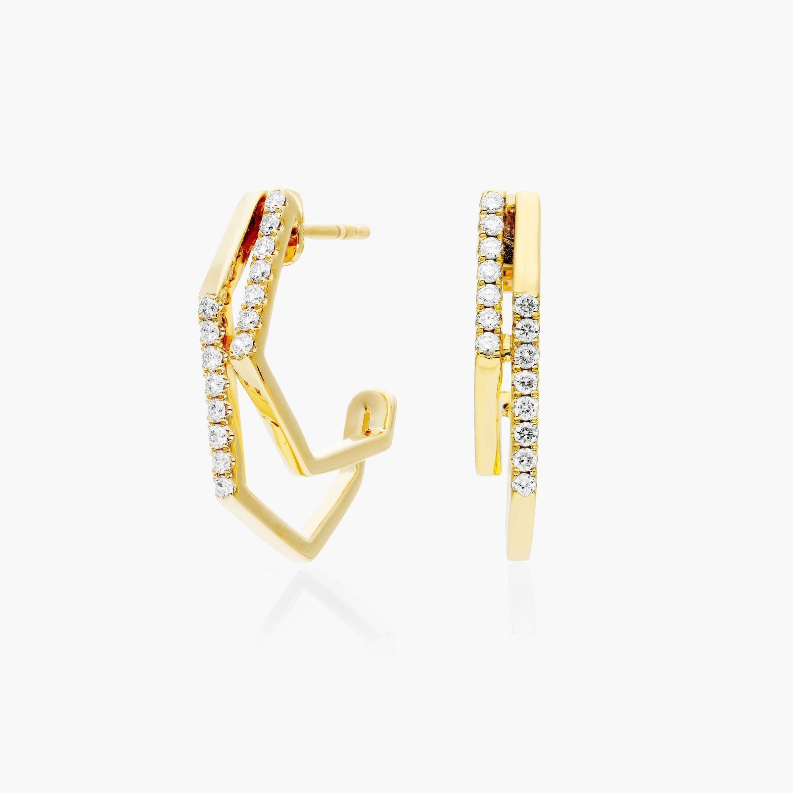 These uniquely designed earrings feature a trendy geometric shape and dynamic diamonds. Perfect to dress up an everyday outfit or as part of a high fashion evening.
