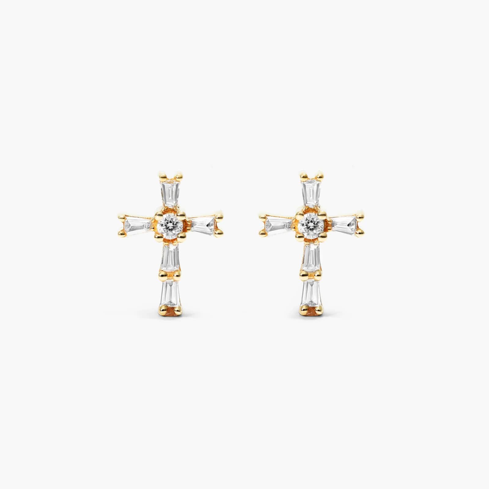 Lovely and petite, these 14K gold earrings feature crosses traced in round and tapered baguette diamonds. The earrings secure with friction backs.