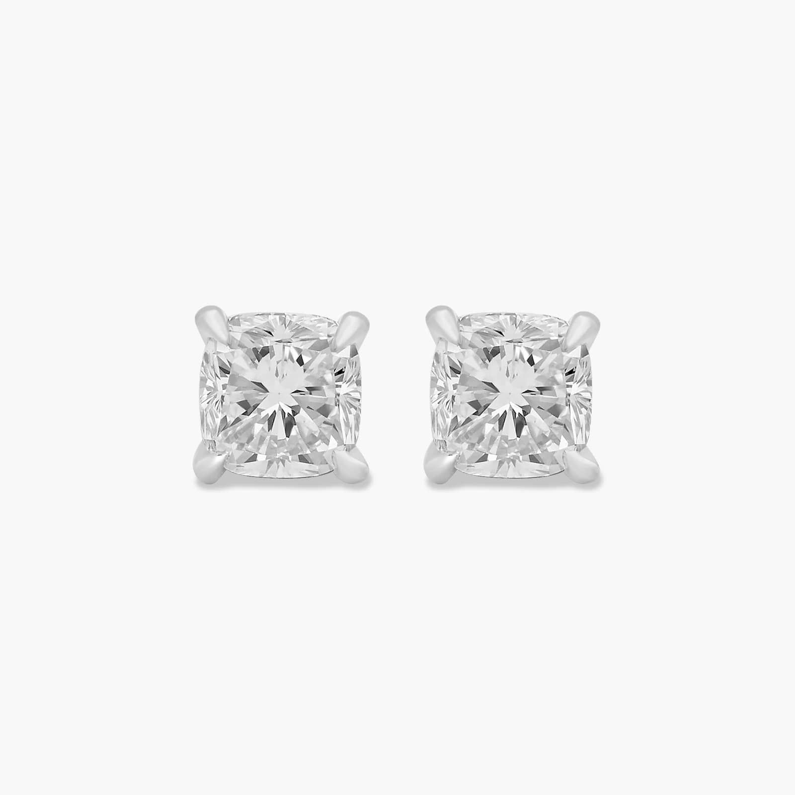 This pair of classic cushion shape diamond earrings feature a tapered basket, showcasing the unique characteristics of a cushion shape diamond. Bold chunks of light shimmer and shine with every move. *Note that the stone shape may vary slightly from the image shown on the website.