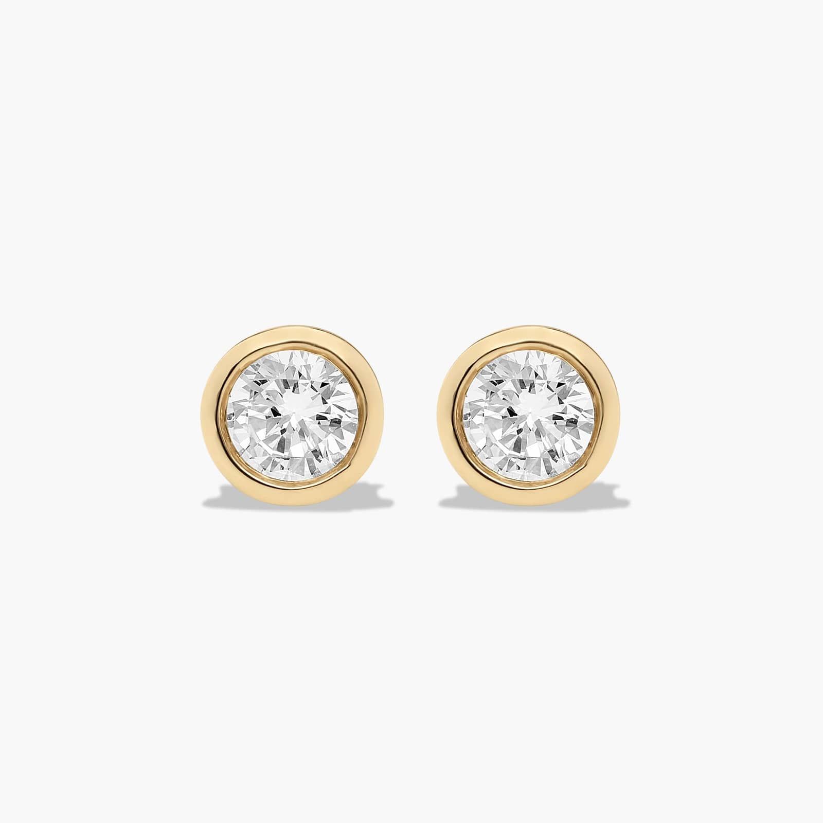 This hand crafted, bold design accents the beauty of the round brilliant diamonds by using a thin bezel and circle accented basket. These earrings will fit snugly against the ear and features friction backs.