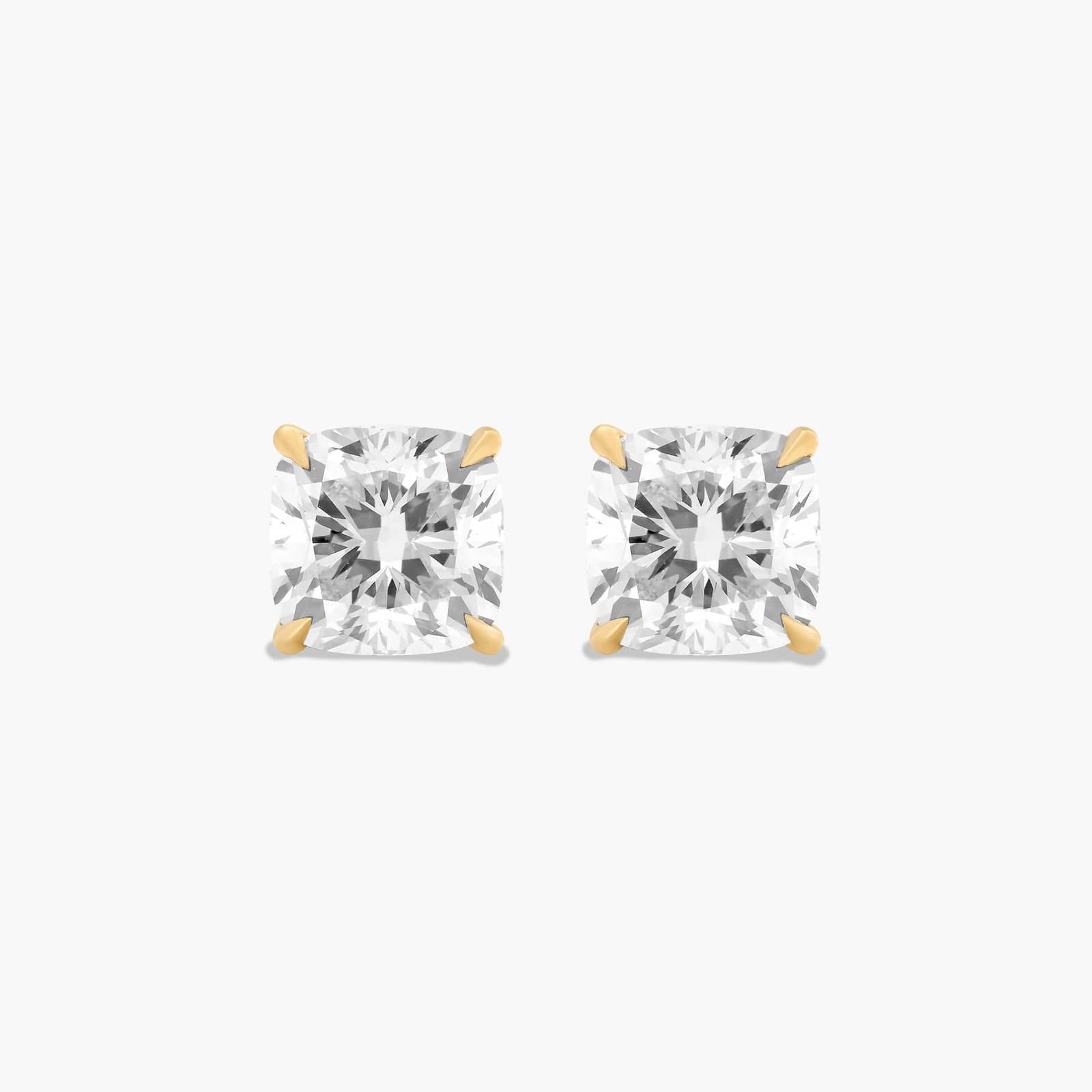 This pair of classic cushion shape diamond earrings feature a tapered basket, showcasing the unique characteristics of a cushion shape diamond. Bold chunks of light shimmer and shine with every move. *Note that the stone shape may vary slightly from the image shown on the website.