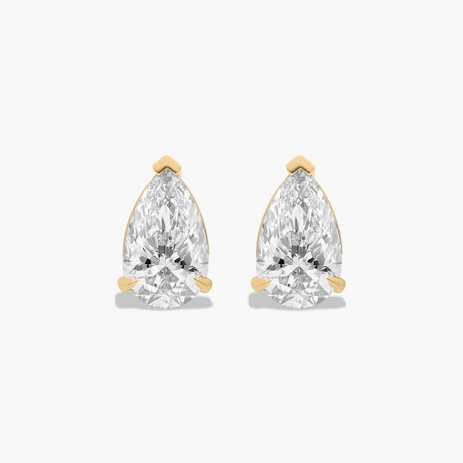 This pair of classic pear shape lab grown diamond earrings feature a tapered basket, showcasing the unique characteristics and striking outline of a pear shape lab grown diamond. Splinters of light shimmer and shine with every move.