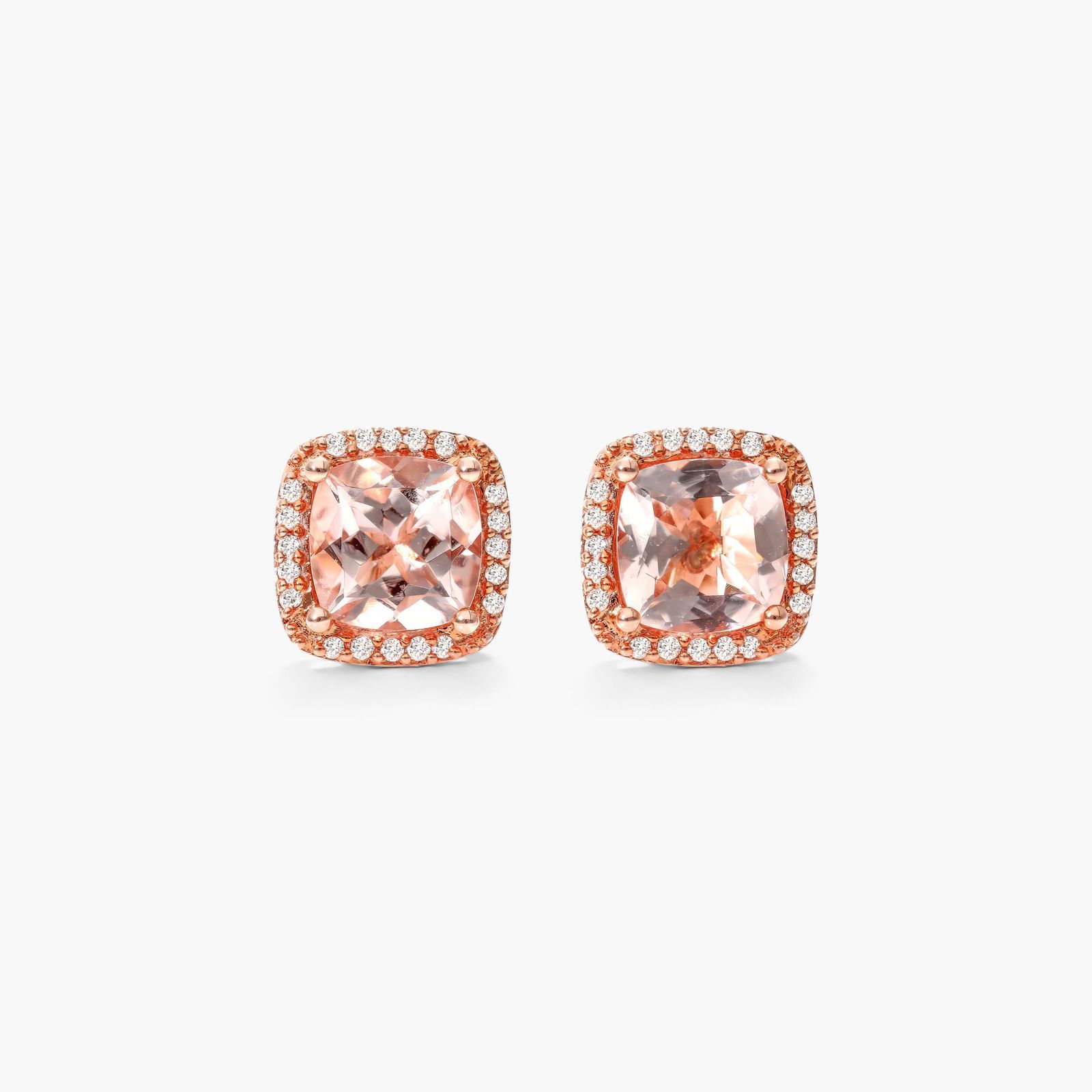 Cushion Cut Morganite And Diamond Halo Stud Earrings In 14K Rose Gold