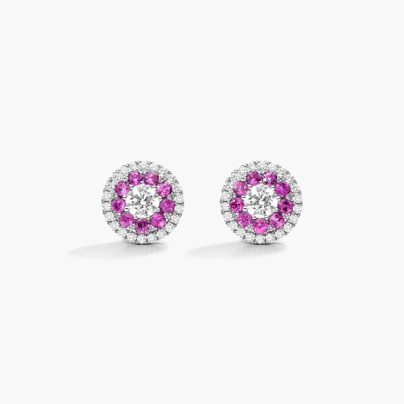 Emphasize the ultimate luxury and rich color of pink sapphires with the natural beauty of diamonds. These studs feature alternating circles of diamonds and pink sapphires set in 14K white gold for a classic look with a stunning pop of color.
