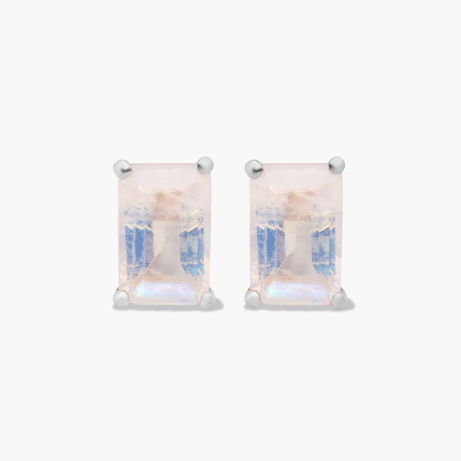 Emerald Cut Rainbow Moonstone Birthstone Stud Earrings In 14K White Gold