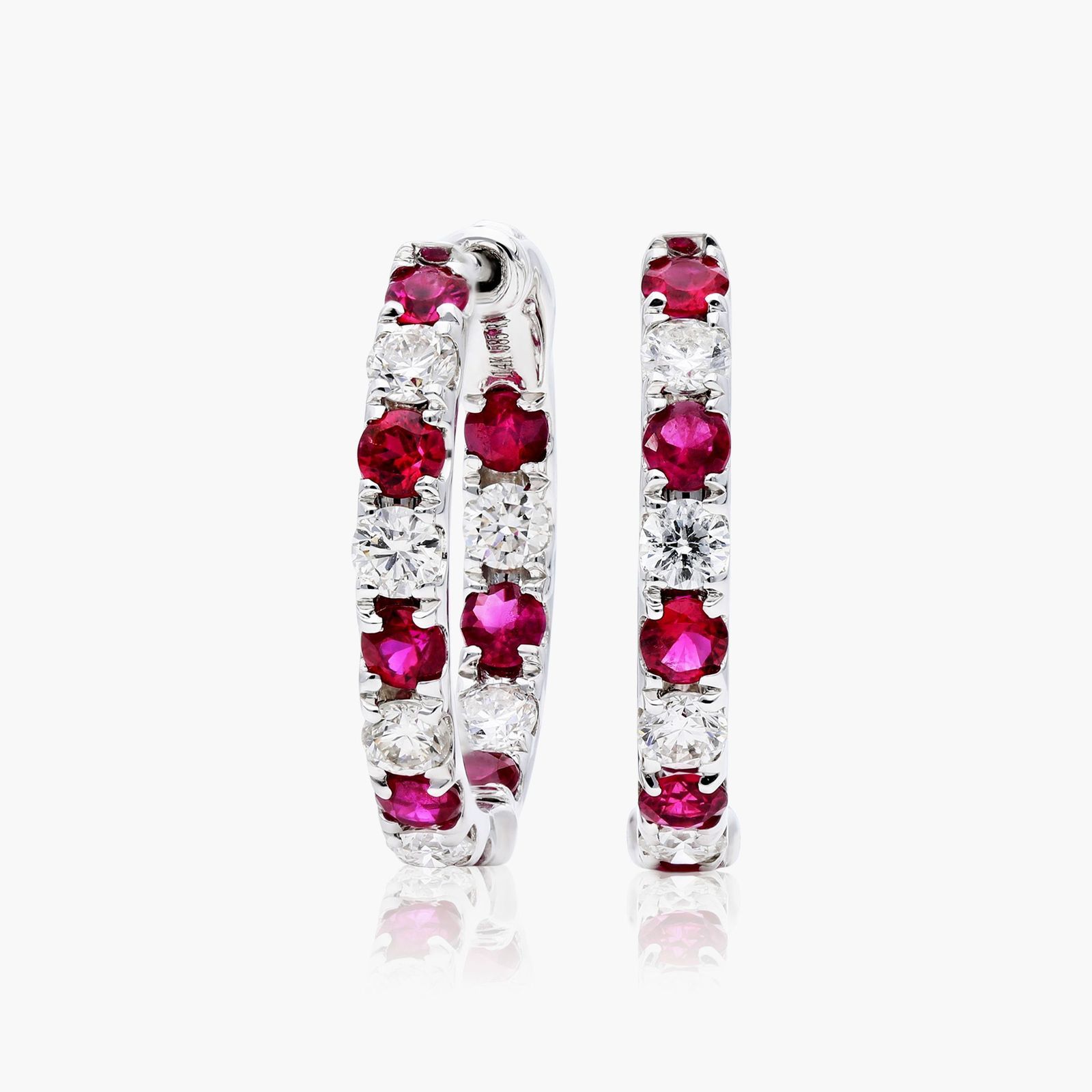 Make a grand entrance with this stunning pair of hoops featuring alternating round cut rubies and diamonds exquisitely crafted in 14k white gold. A high polish smooth finish and inside-out design ensures glamour and sparkle from every angle.