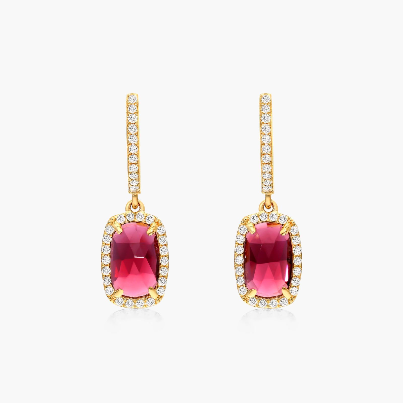 Elongated Cushion Cut Garnet And Diamond Halo Drop Earrings In 14K Yellow Gold