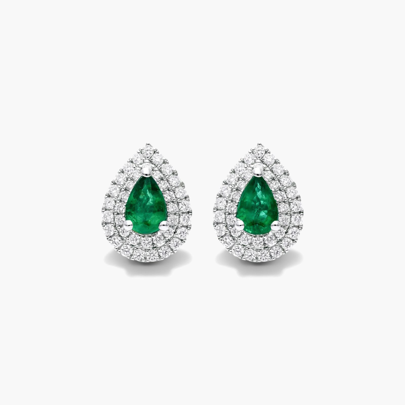 Pear Shape Emerald And Diamond Double Halo Earrings In 18K White Gold