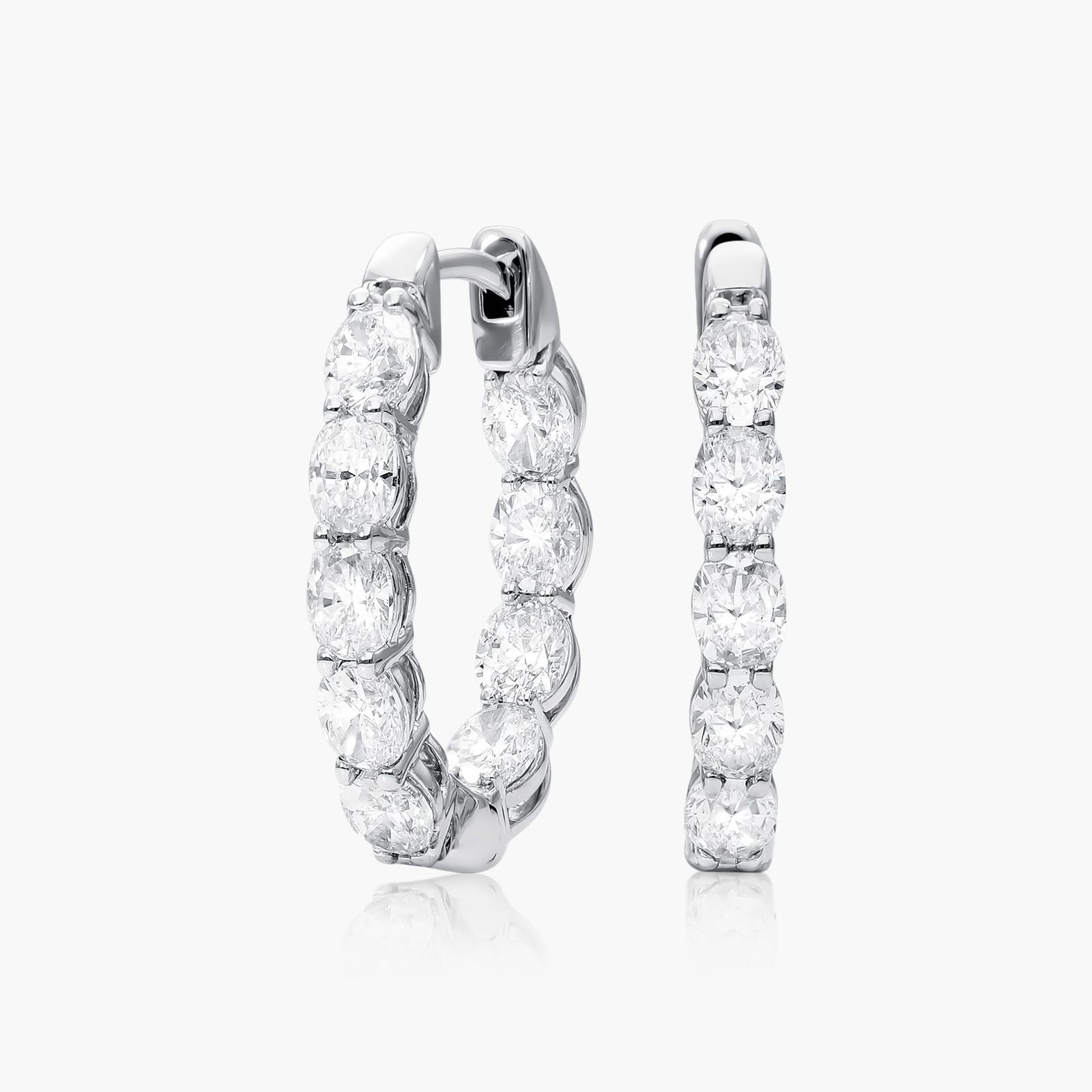 Elegant elliptic hoops have oval shaped Lab-Grown diamonds inside-out so no sparkle is left unnoticed. These glamorous statement hinged hoop earrings feature a basket setting and a snap post closure.