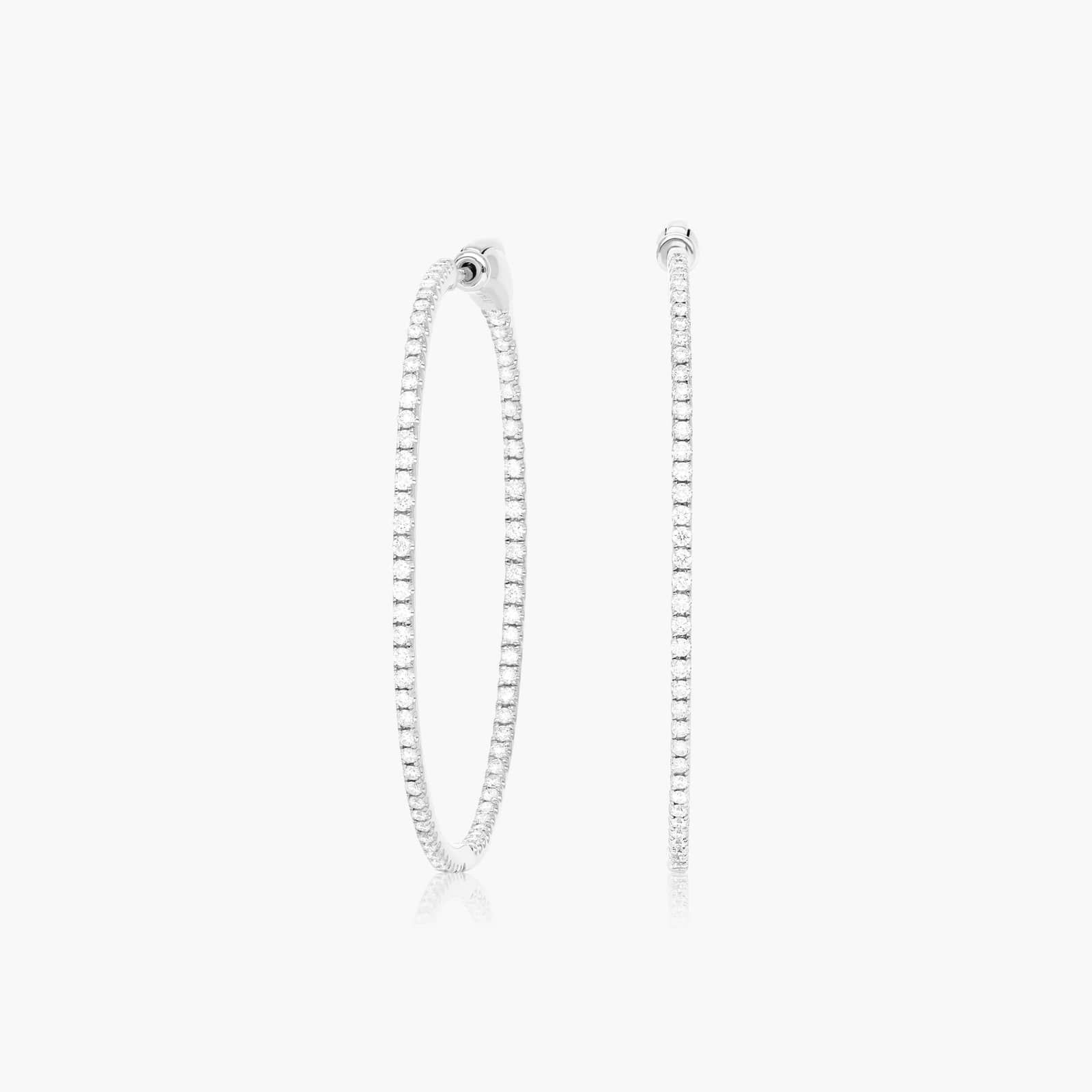 Make a grand entrance with this chic pair of diamond round hoops! Exquisitely crafted in 14k white gold with highly polished smooth finish. The hoops feature an inside out design prong set with round brilliant cut diamonds, nicely secured with comfortable hinged snapbacks. These gorgeous hoop earrings are a staple for every jewelry connoisseur!
