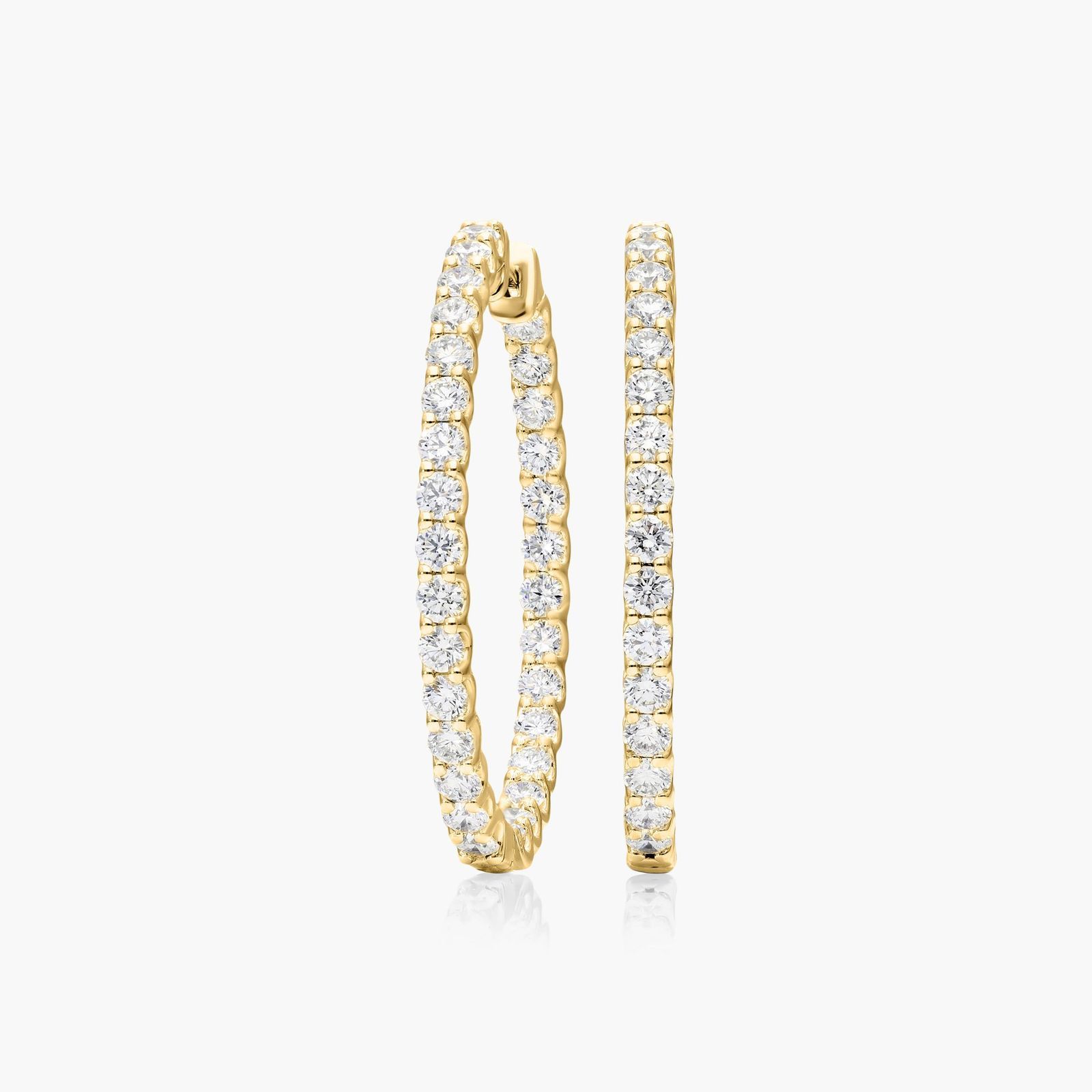 Elegant elliptic hoops have round brilliant Lab-Grown diamonds inside-out so no sparkle is left unnoticed. These glamorous statement hinged hoop earrings feature a U shape setting that contours the diamond and a snap post closure.