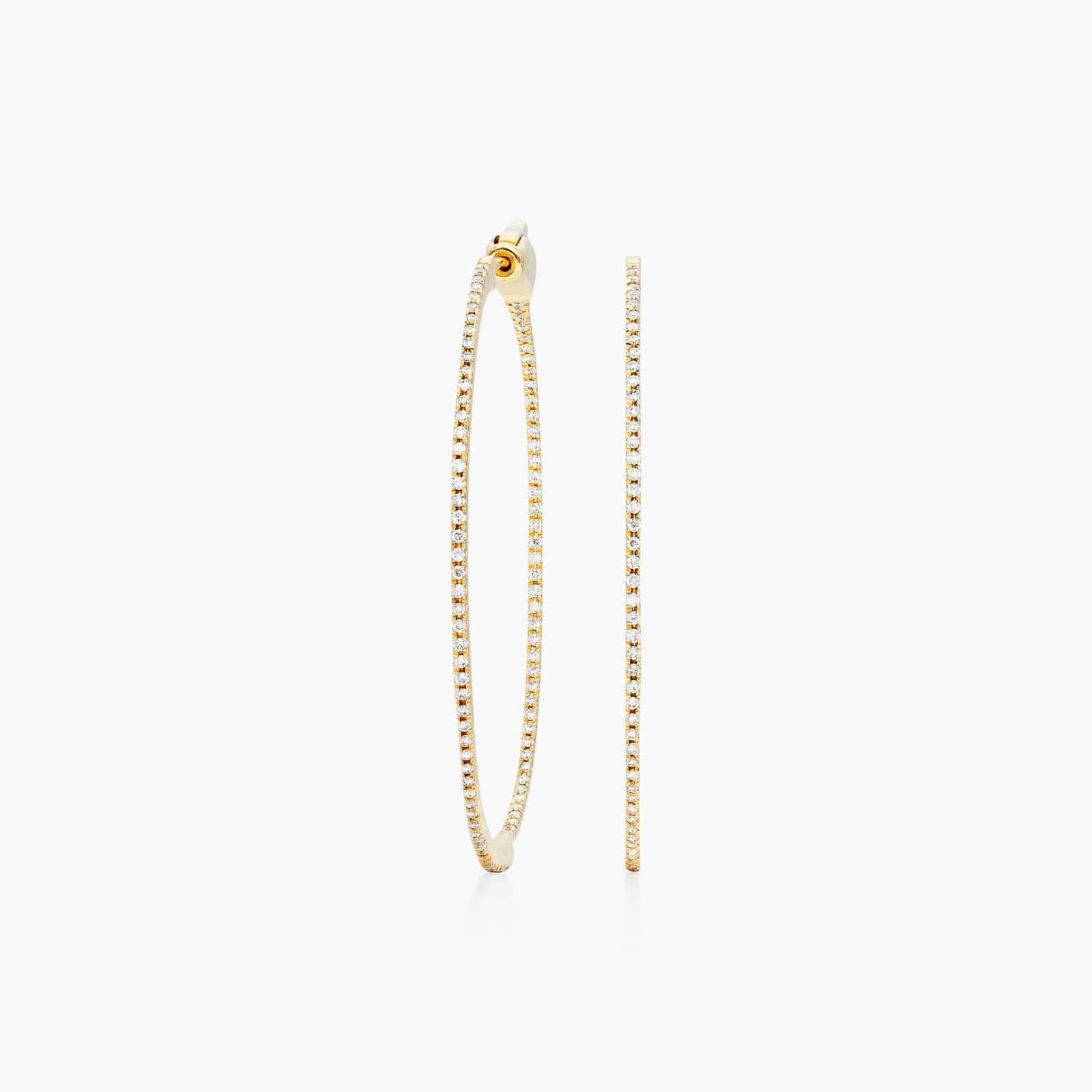 Make a grand entrance with this chic pair of diamond round hoops! Exquisitely crafted in 14k yellow gold with highly polished smooth finish. The hoops feature an inside out design prong set with round brilliant cut diamonds, nicely secured with comfortable hinged snapbacks. These gorgeous hoop earrings are a staple for every jewelry connoisseur!