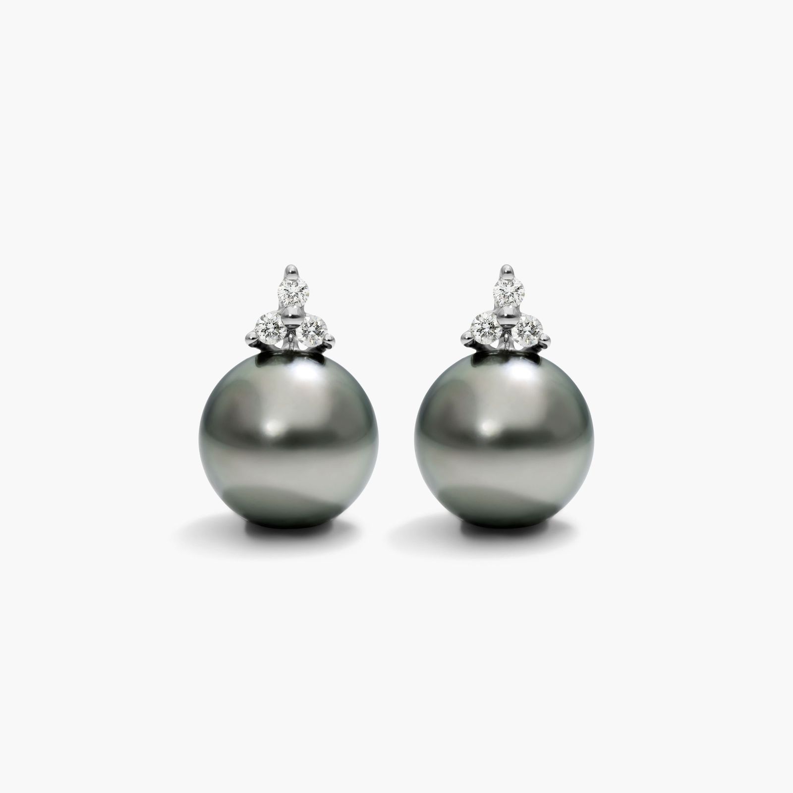 A must in any jewelry collection, this pair of gorgeous 9.0 to 10.0 mm Tahitian pearl studs offers a little extra with a dazzling, prong set trio of diamonds for a regal take on a sophisticated staple.