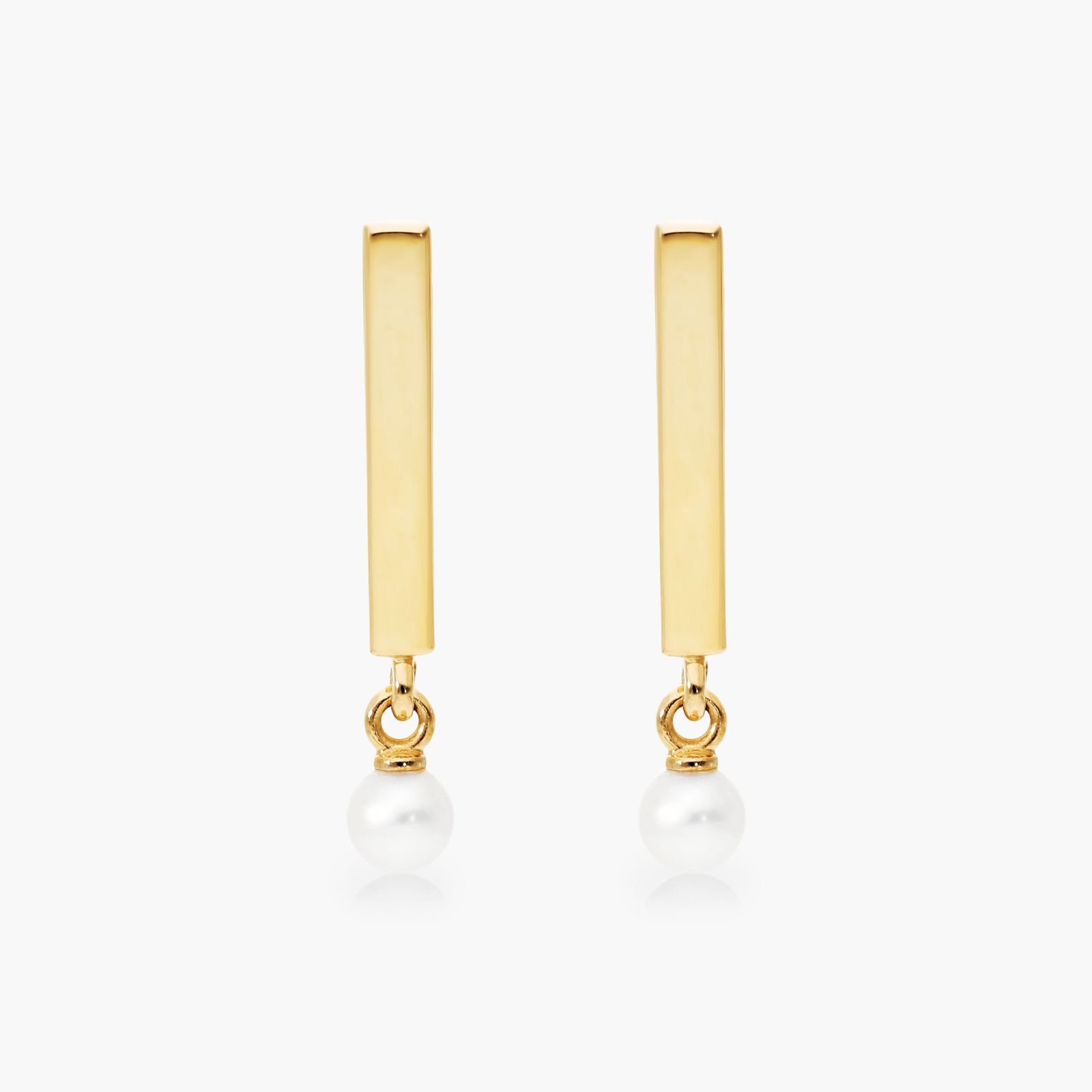 A petite pearl dangles on the end of a high polish gold bar for an effortless look. Friction backs secure these earrings in place.