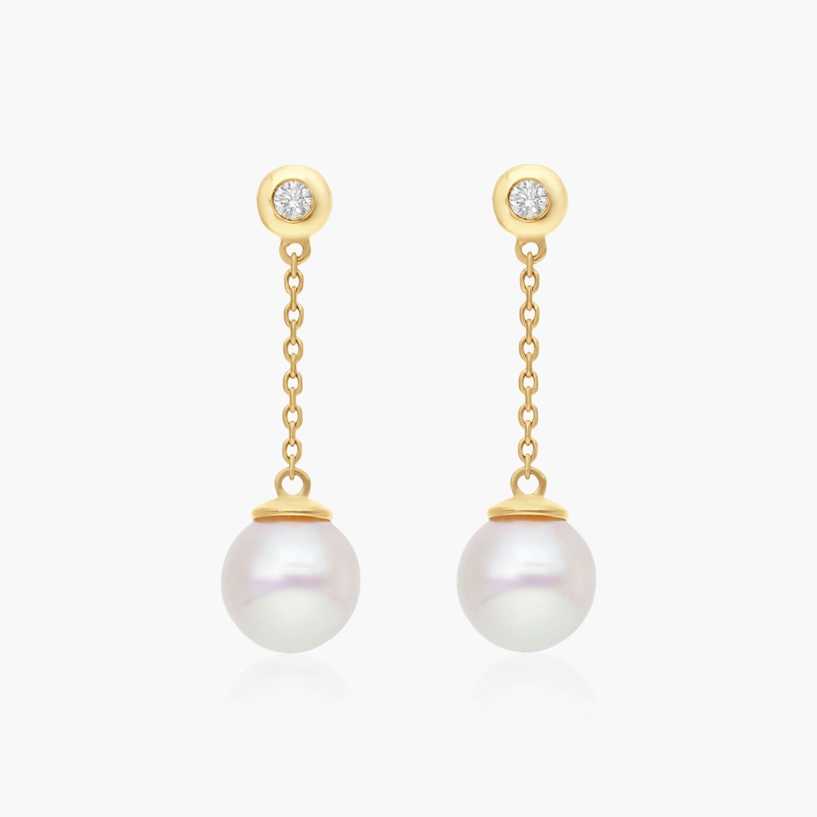 The simplicity of these drop earrings featuring 8.0-8.5mm akoya pearls is all the more luxurious with the added touch of a bezel set diamond. An excellent present for anyone who appreciates simple glamour.