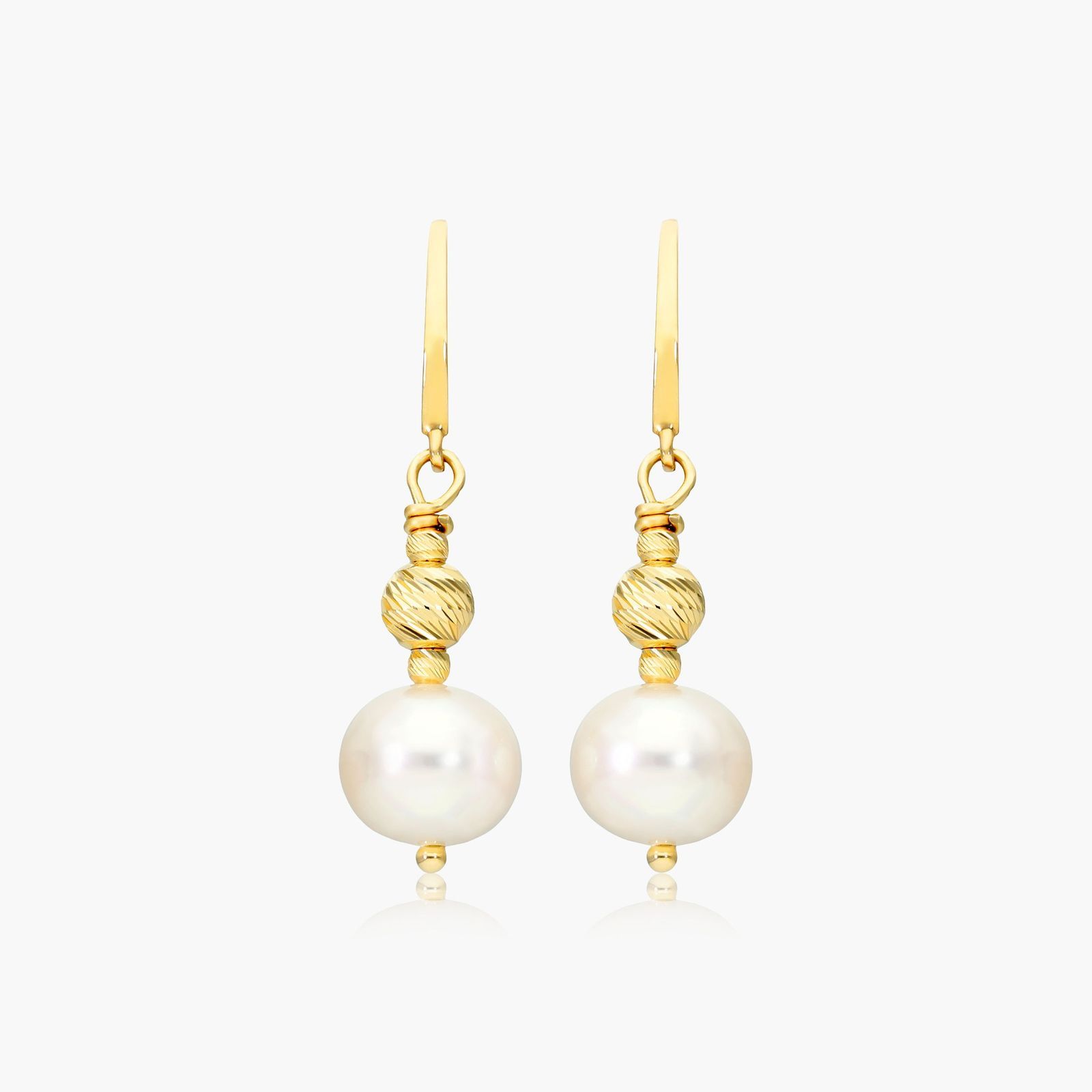 This pair of drop 7.5-8.0mm freshwater pearl earrings feature textured 14K yellow gold brilliance beads for an effortlessly chic and glamorous look.