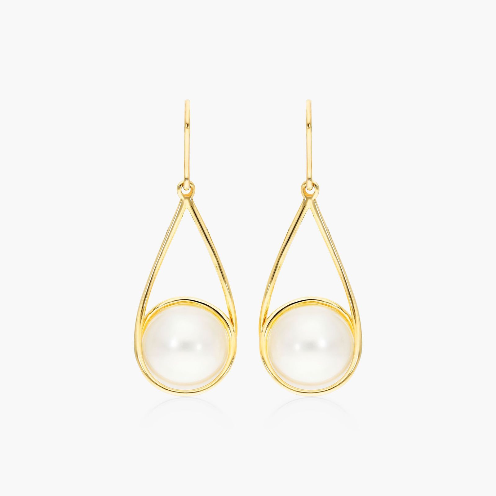 In this gracefully minimal design, a simple 14K yellow gold wire wraps around 9.5-10.0mm freshwater pearls to create this swirling drop earring design.
