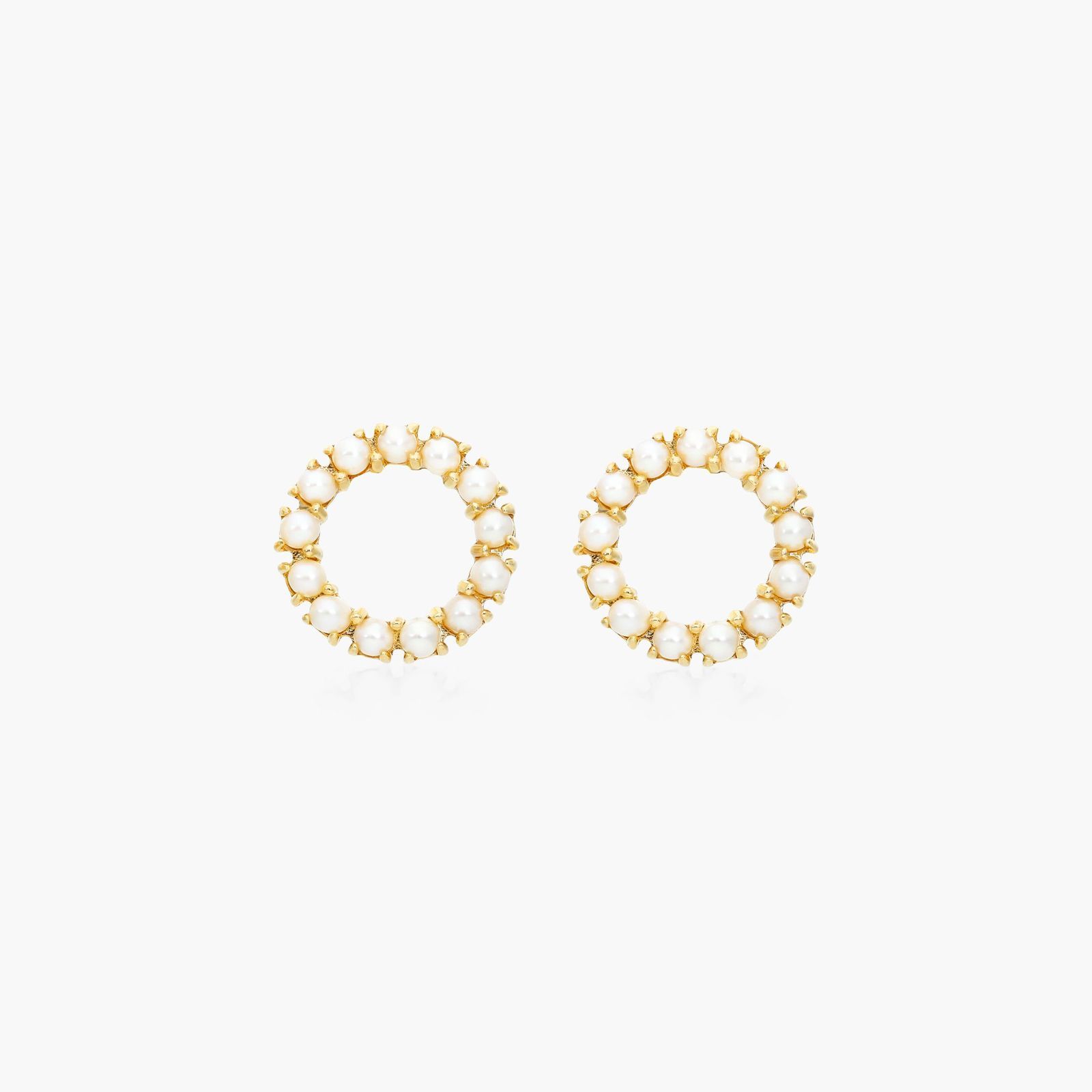A halo of 2.0mm seed pearls set on 14K yellow gold form the centerpiece of this delicate pair of earrings. A perfect fit for those looking for contemporary designs in a luxurious finish.