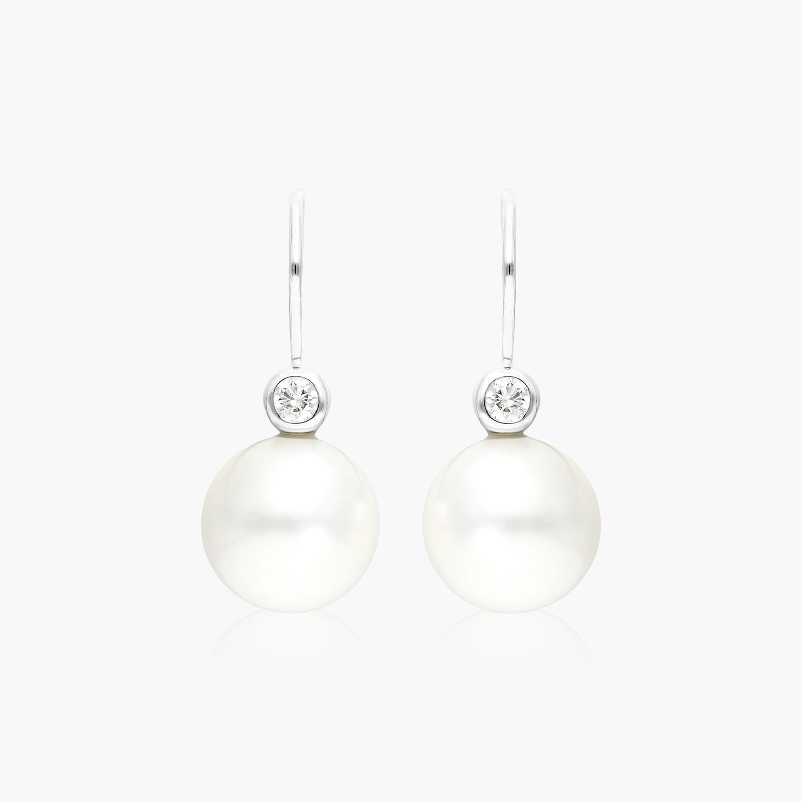 This elegant pair of drop earrings features beautiful 11.0 to 12.0 mm South Sea pearls with bezel set diamonds for a timelessly luxurious look.