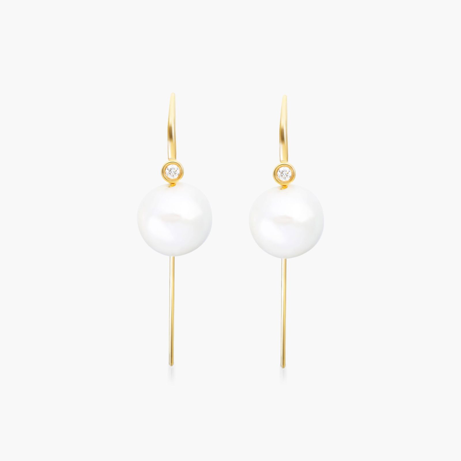 These earrings feature a 10mm freshwater pearl with an accent bezeled diamond on a wire threader hook.