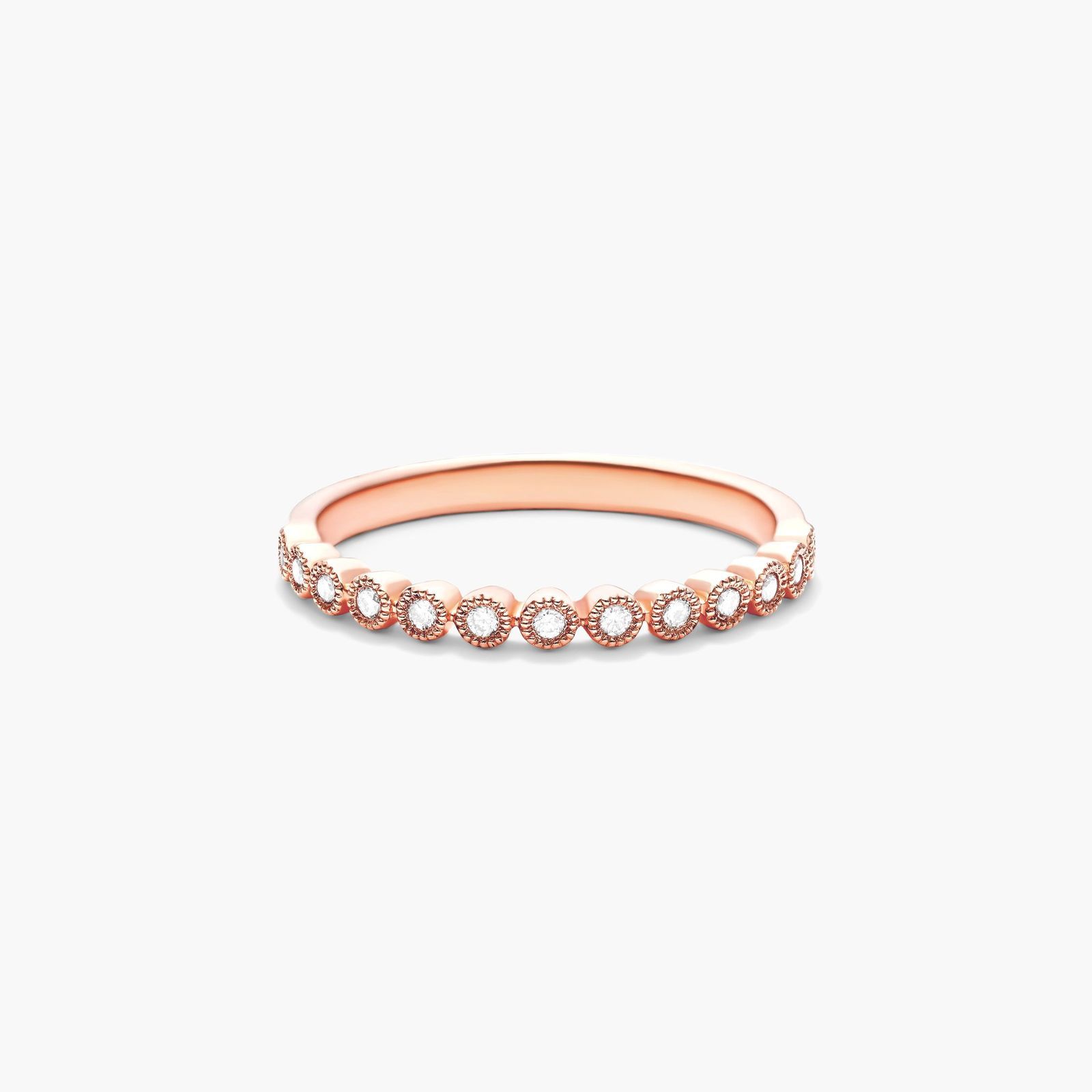 This vintage inspired half eternity band features dazzling round brilliant cut diamonds in a bezel setting with ornate milgrain contour that adds a timeless elegance. This band can be worn individually or with two or more stackable bands to create a unique look.