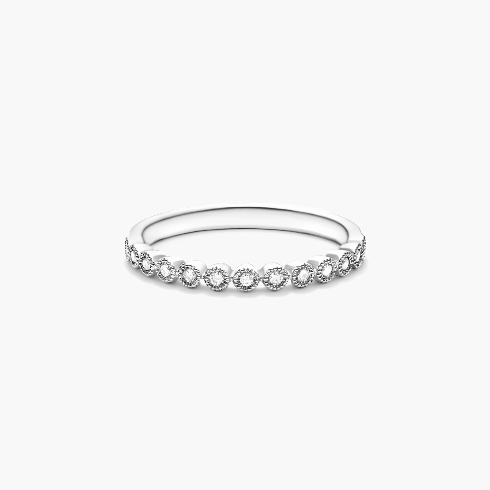 This vintage inspired half eternity band features dazzling round brilliant cut diamonds in a bezel setting with ornate milgrain contour that adds a timeless elegance. This band can be worn individually or with two or more stackable bands to create a unique look.