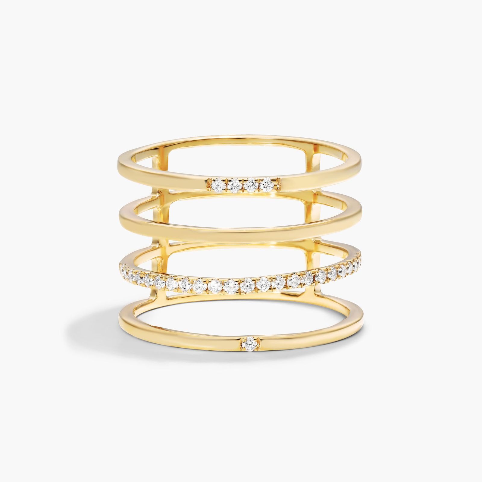 The sparkles in the ring are matched by the smoothness of the metal. Featuring four rows, this minimalist style will highlight your stand out fashion sense. Wear it alone or pair it with more sparkles, you will be sure to dazzle whenever you don this trendy piece.