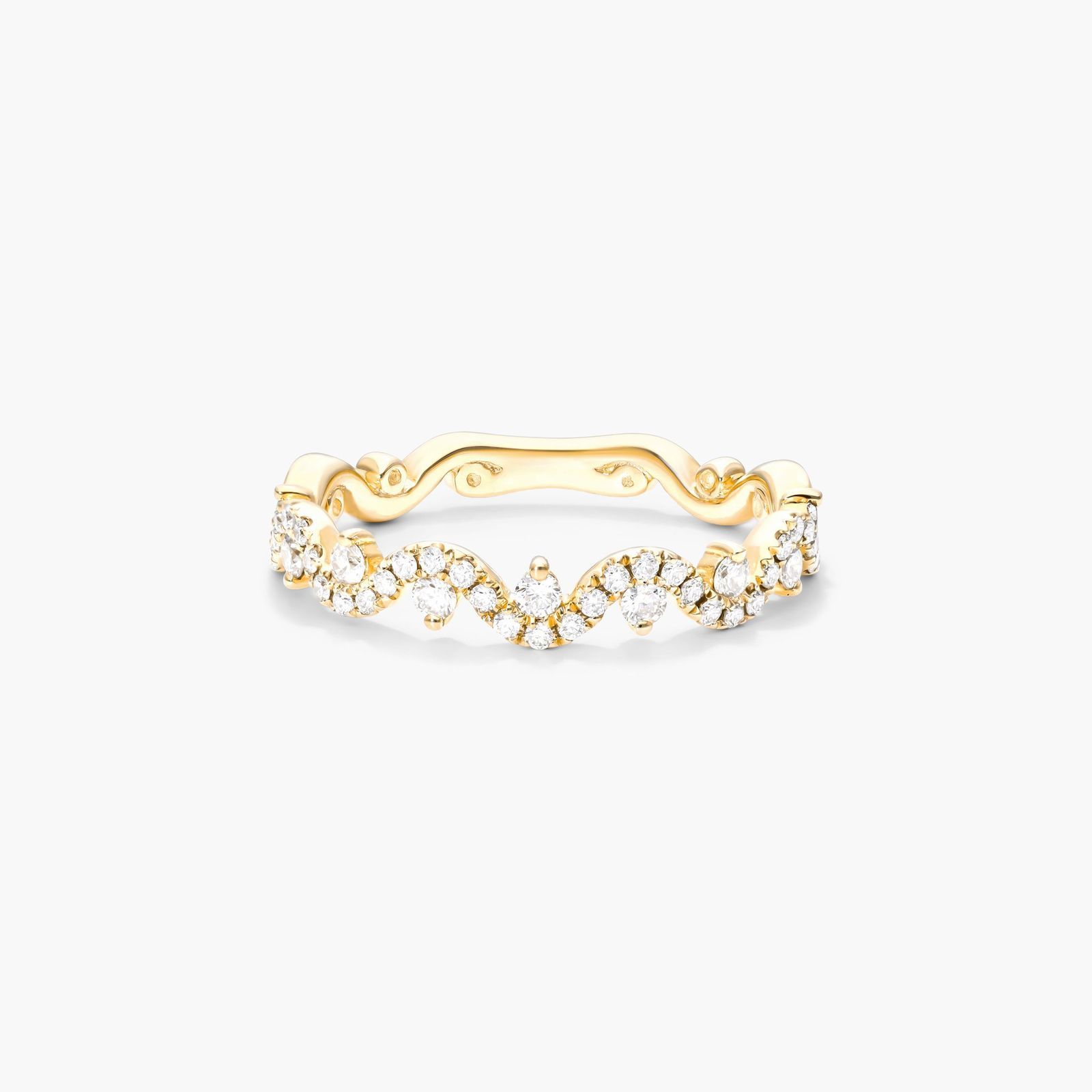 This unique petite ring features a wave of brilliant round cut diamonds set in 14K gold. An additional diamond set alternating along the curves, this ring is simply beautiful on its own or with other stackables.