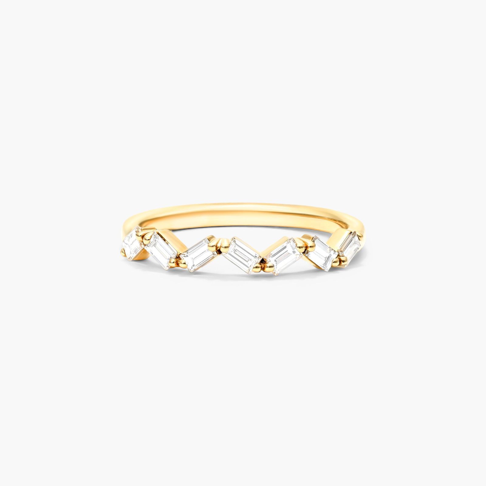 Baguette diamonds in two-prong settings are positioned to form a zig-zag line. Wear alone or as a stackable and achieve the wow factor!