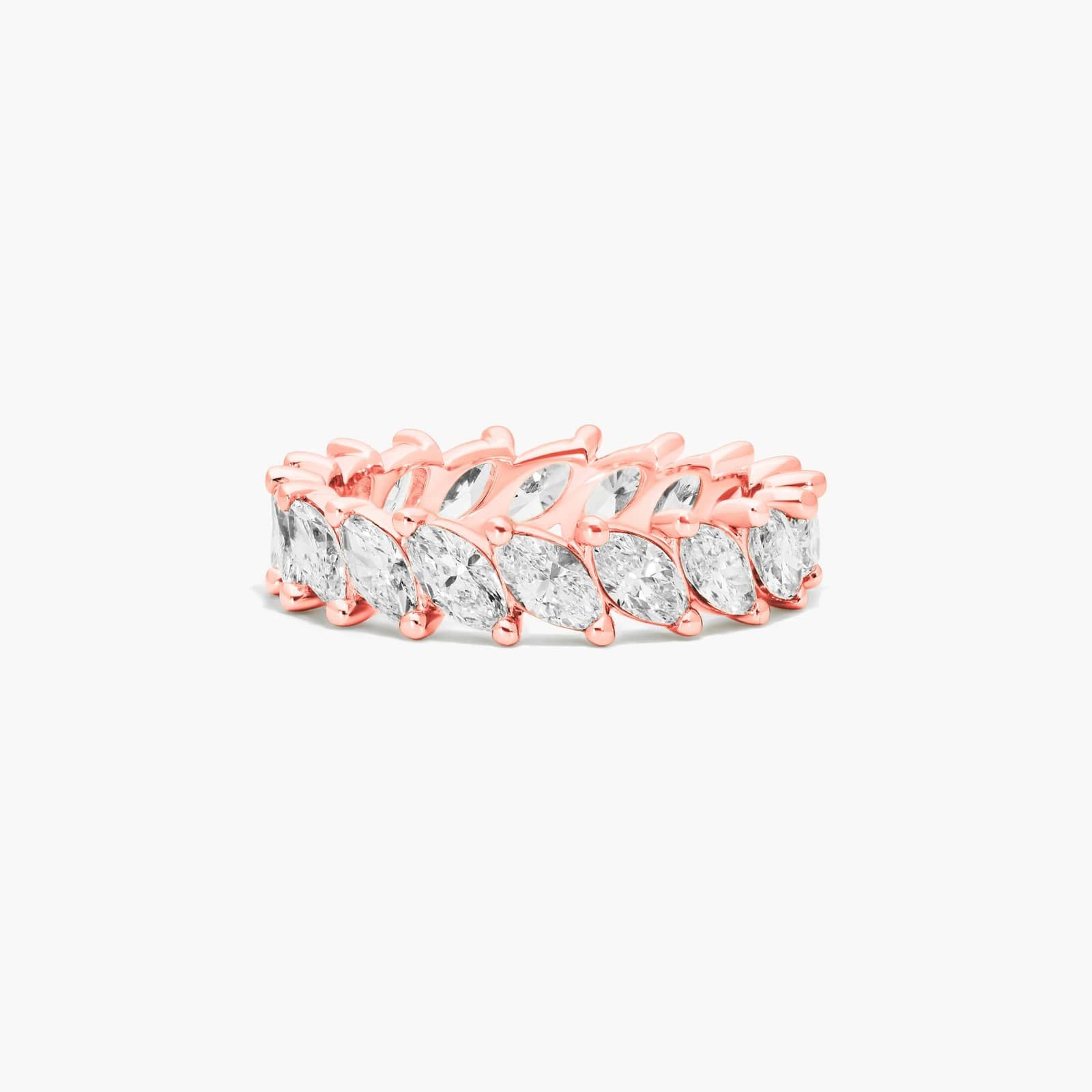 If you are looking for fun and different, look no further. Marquise diamonds are set in a diagonal orientation creating a modern yet luxurious design.