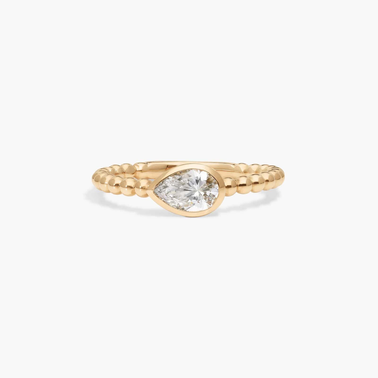 This ring is perfect for solo styling or ring stacking. With 14k yellow gold beaded details and a bezel set pear shaped lab-grown diamond, it's the perfect addition to any jewelry box.