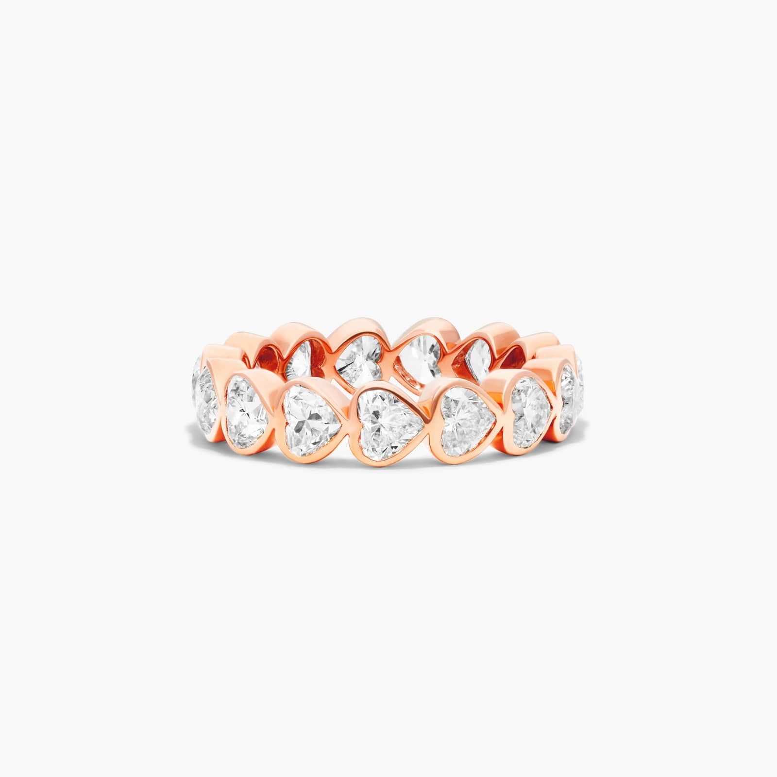 This eternity ring features a stream of heart shape diamonds for the ever hopeful romantics. This bezel set ring will let your heart shine through.