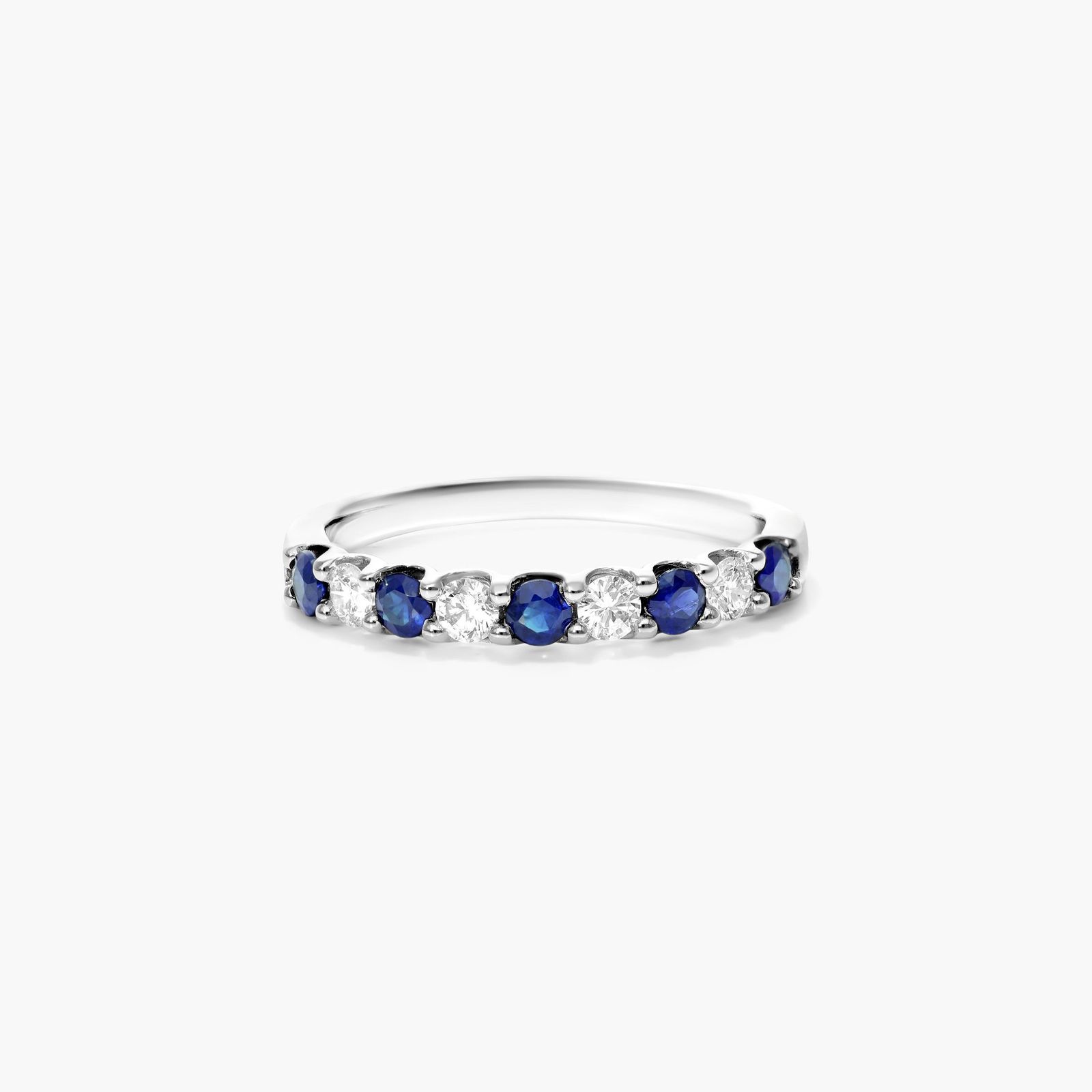 This band features alternating prong set sapphire and diamonds for a colorful twist on a fine jewelry staple.