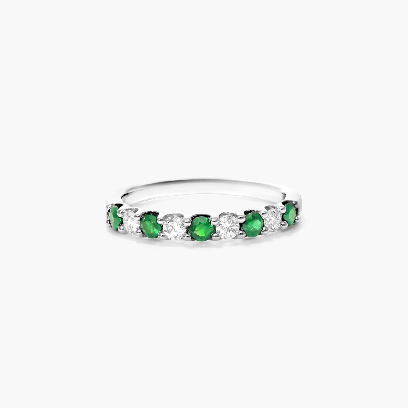 This band features alternating prong set tsavorite and diamonds for a colorful twist on a fine jewelry staple.