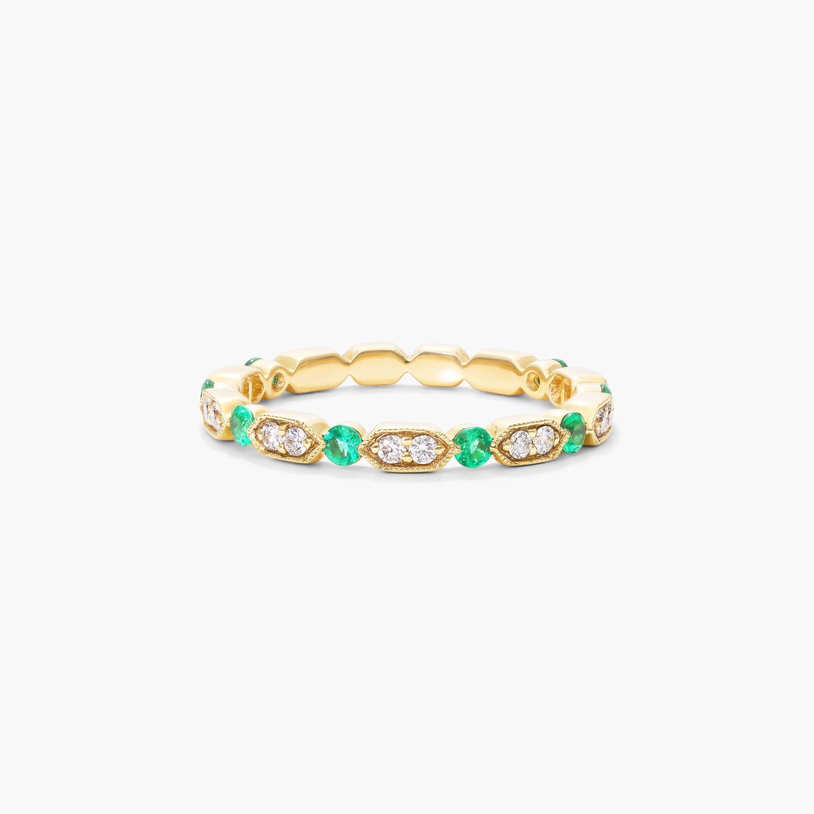 Alternating Arrow Shape Milgrain Bezel Emerald And Diamond Ring In 14K Yellow Gold