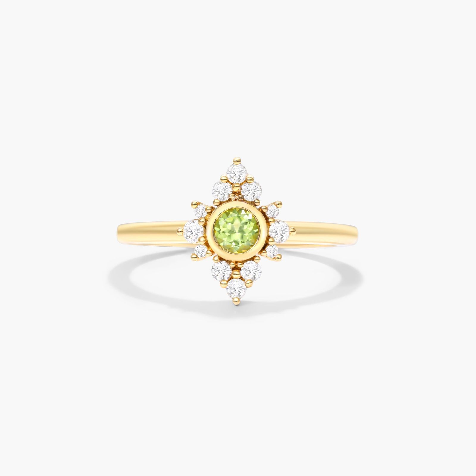 The vivid bright green of the peridot is accompanied by a vintage inspired frame of flickering diamonds. This dreamy ring is crafted in 14K yellow gold.
