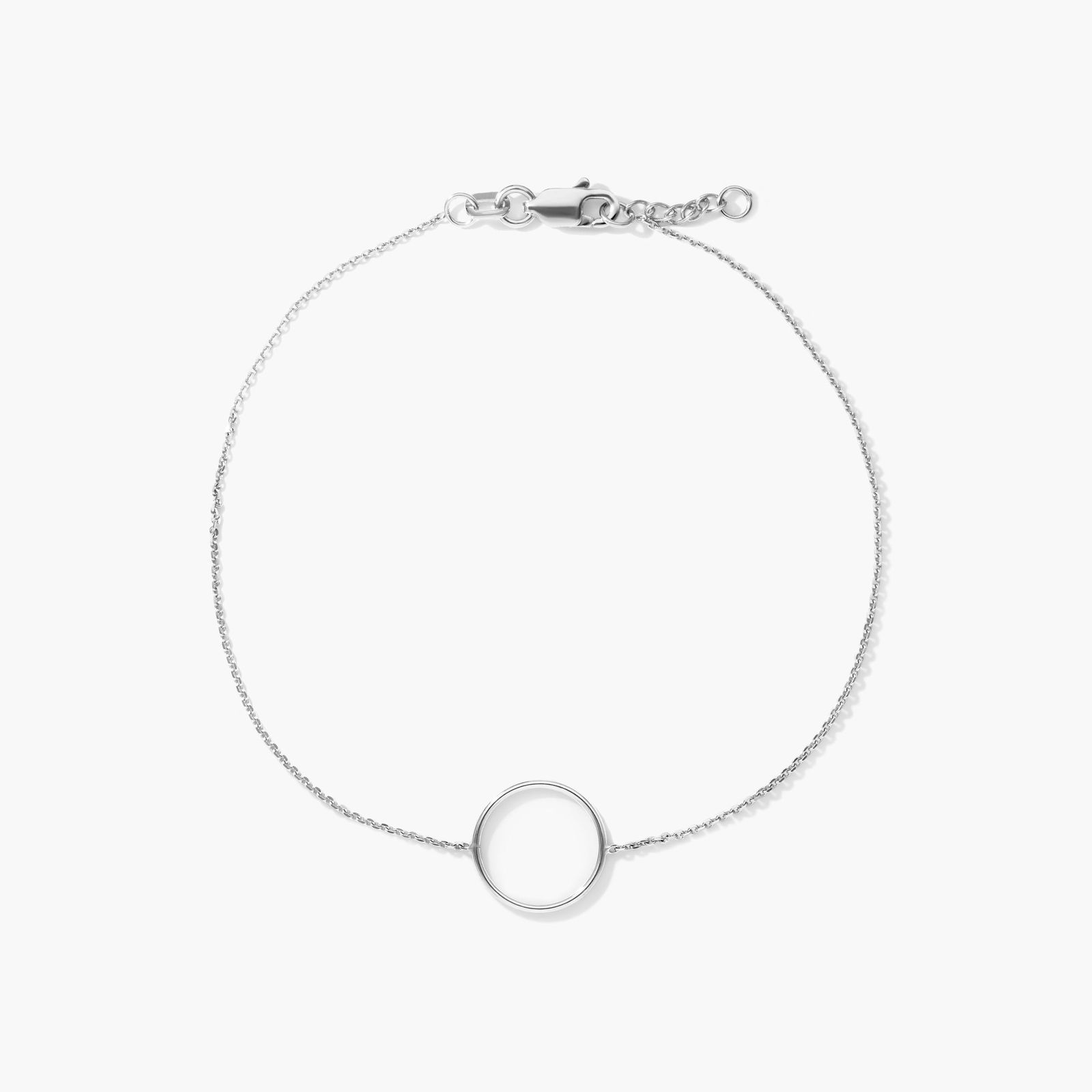 14K white gold open circle charm on 7 inch diamond cut cable chain bracelet with 0.5 inch extender that closes with a lobster claw clasp.