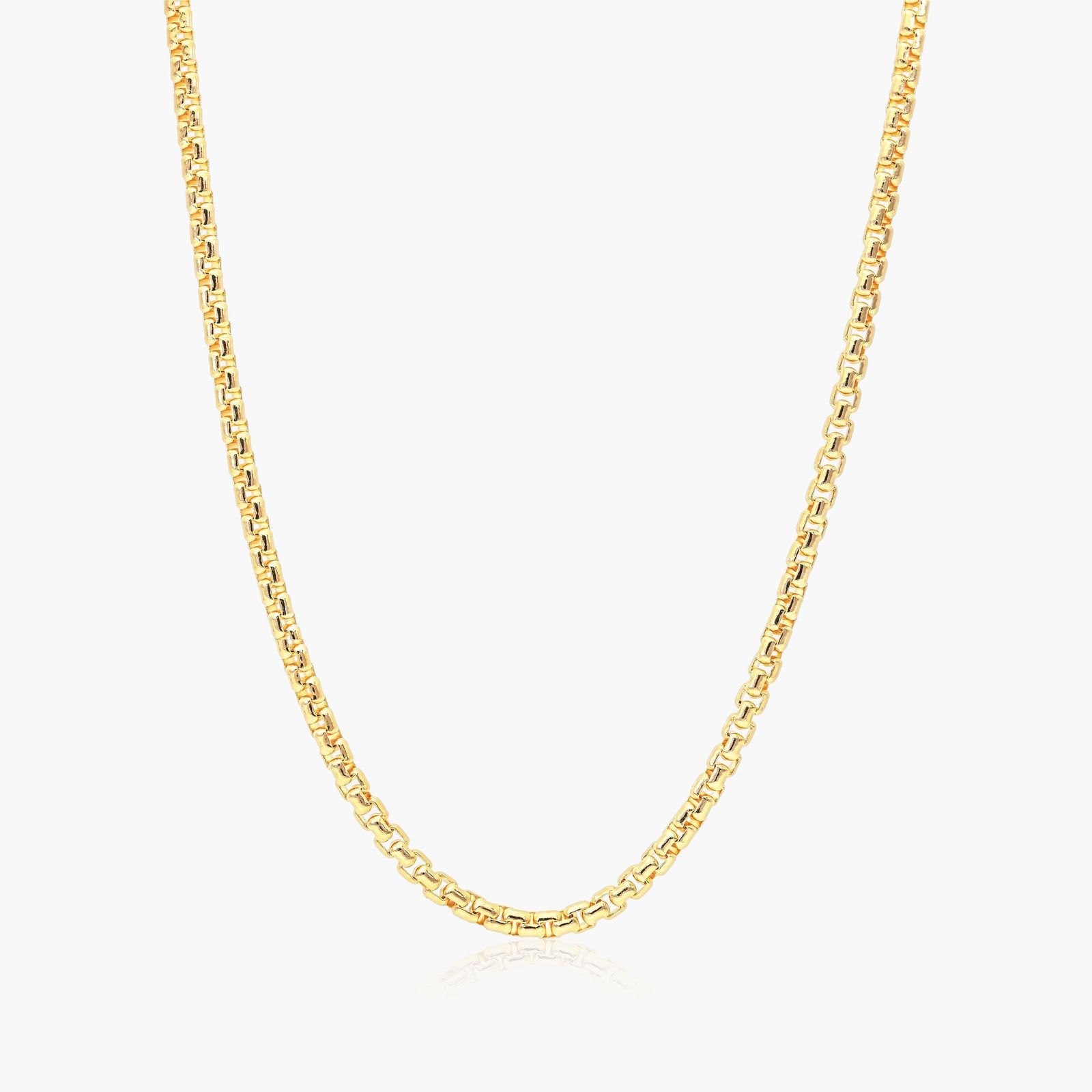 A classic and elegant piece. This 2.6mm solid round box chain is crafted in 14K yellow gold. This chain measures 18 inches and secures with a lobster claw clasp.