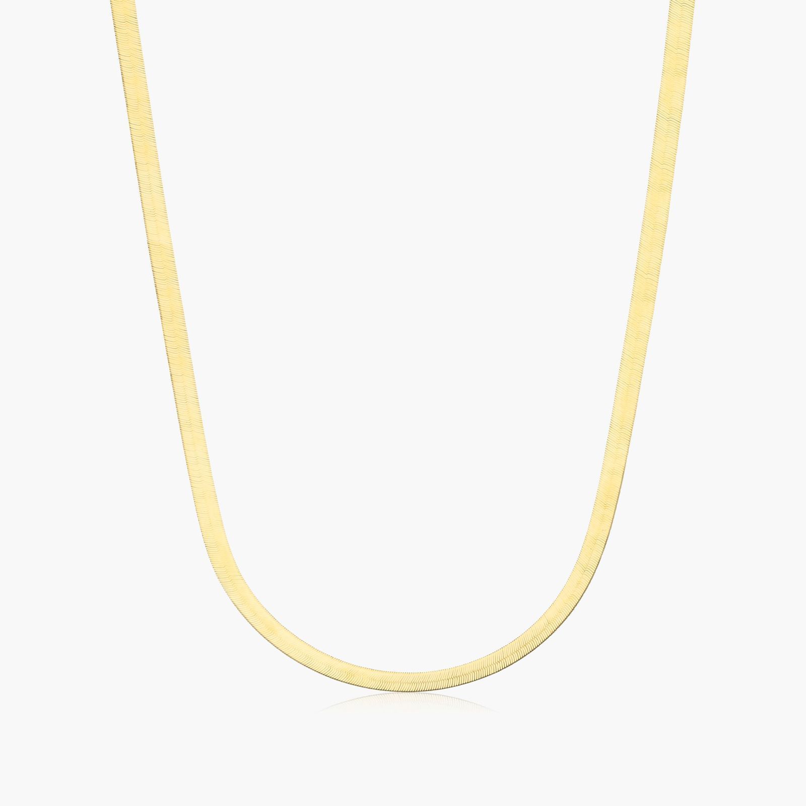 This stunning 5.1mm Herringbone chain gets its alluring appearance from tiny tessellated links that create a sheen like no other. Crafted in 14K yellow gold this statement piece is 18 inches long and secures with a lobster claw clasp.