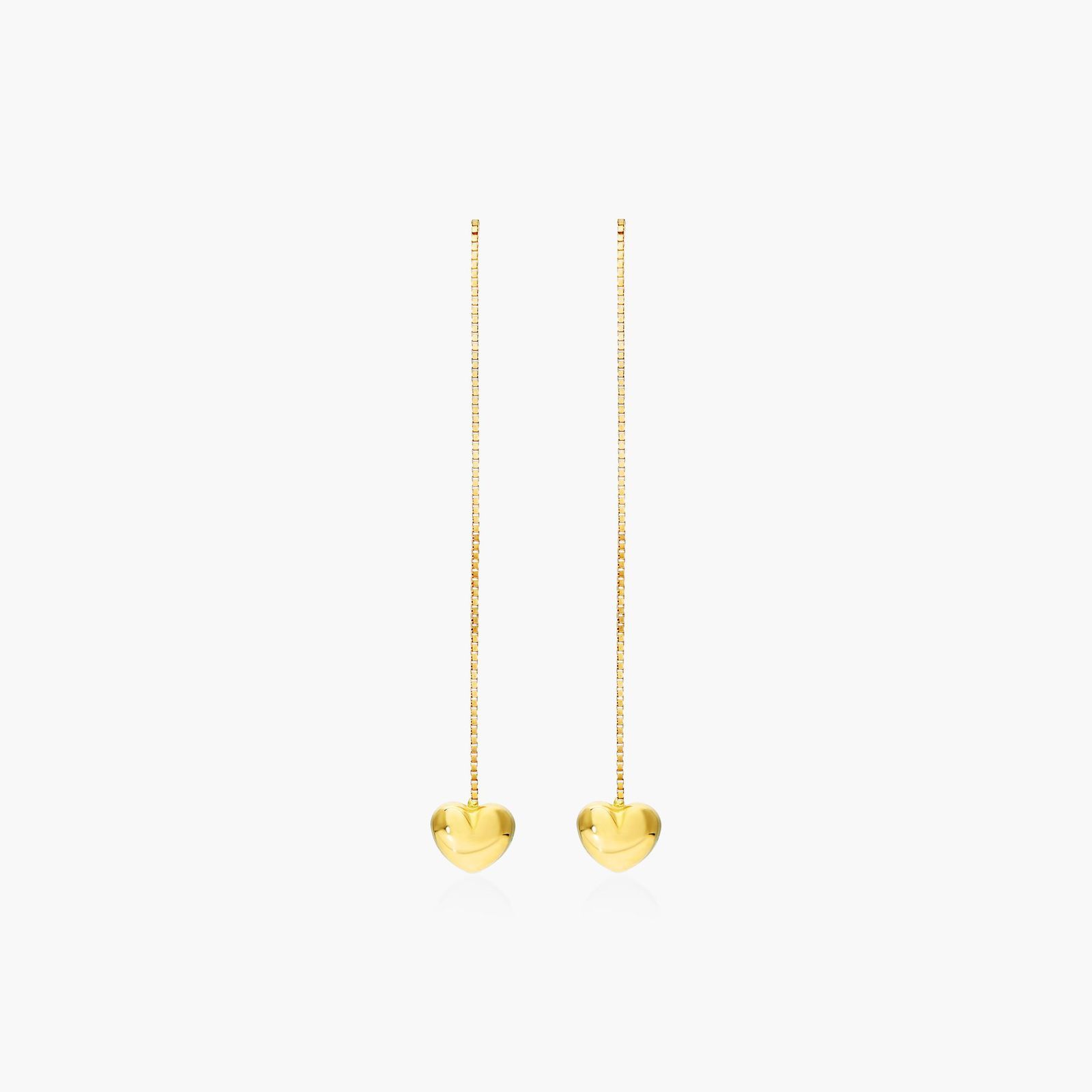 Elevate your heart rate with these 14K yellow gold puffed heart threader earrings suspended on a finely crafted box chain.